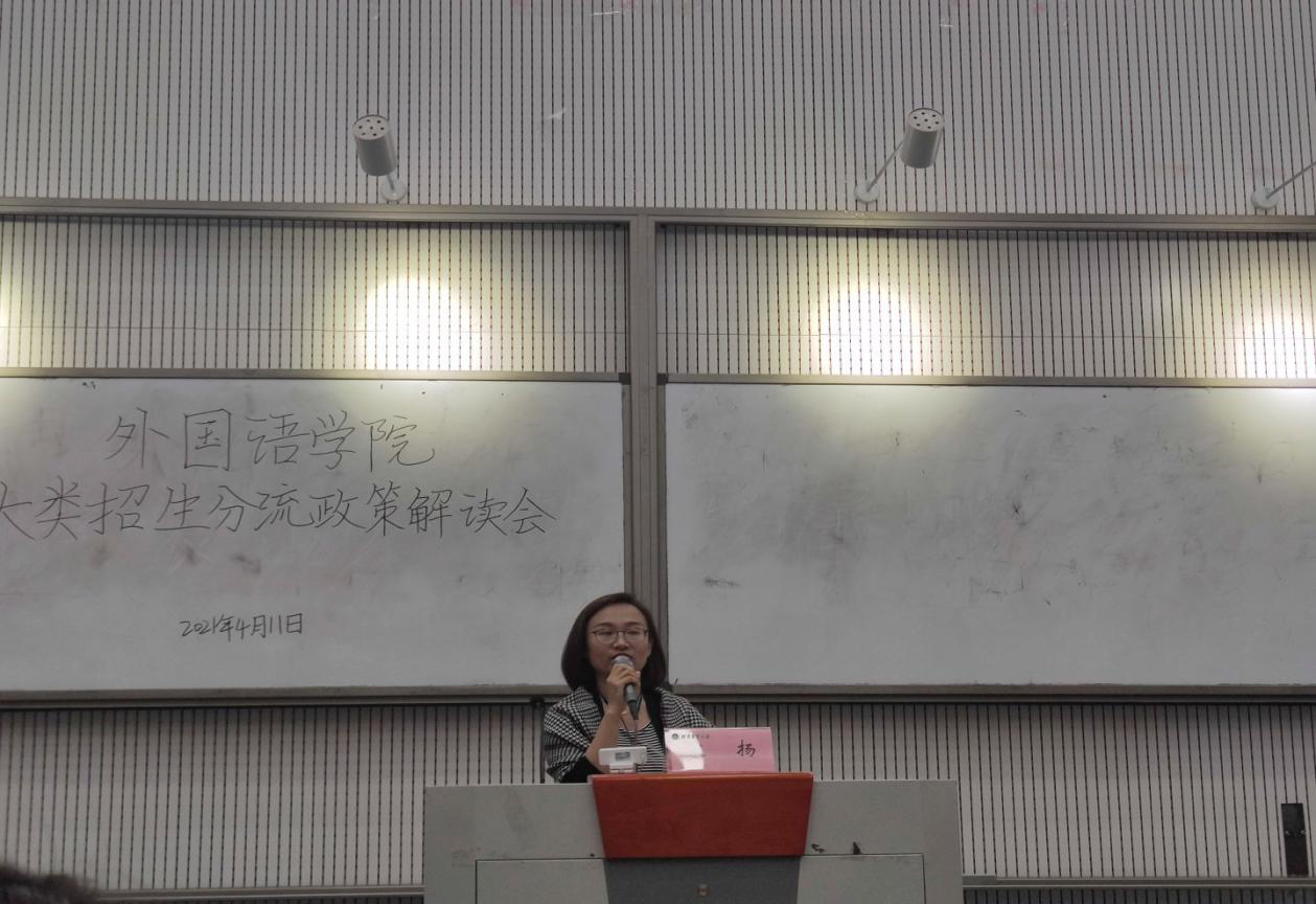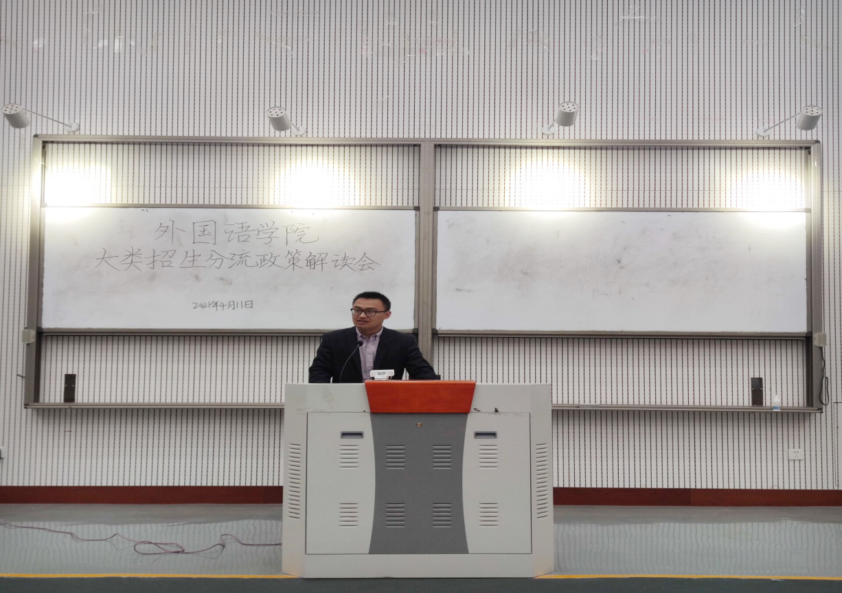 会议伊始,冯超首先做了专业分流的动员讲话。他介绍了大类招生的背景和意义,分析了本次分流的基本情况,并为同学们选择专业提出了建议,希望同学们根据个人兴趣和特长,综合考虑,慎重选择;随后,周晓辉、张明玺、柴奇老师分别就英语、翻译、商务英语三个专业围绕专业设置、就业和考研方向等问题,为同学们进行了详细解读。周晓辉老师详细介绍了英语专业的开设情况和课程设置,并对同学们提出两点希望,一是树立正确的三观,二是要全面发展,紧跟时代步伐,努力成长为复合型人才;在翻译专业方面,张明玺老师指出要打破单一学科培养理念,推动通识教育发展;柴奇老师在对商务英语专业的介绍中邀请了3位优秀毕业生进行视频分享,鼓励大家在以后的学习中积极开拓视野,提高自身的综合素质。