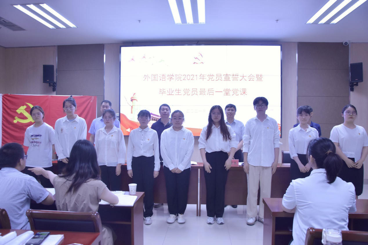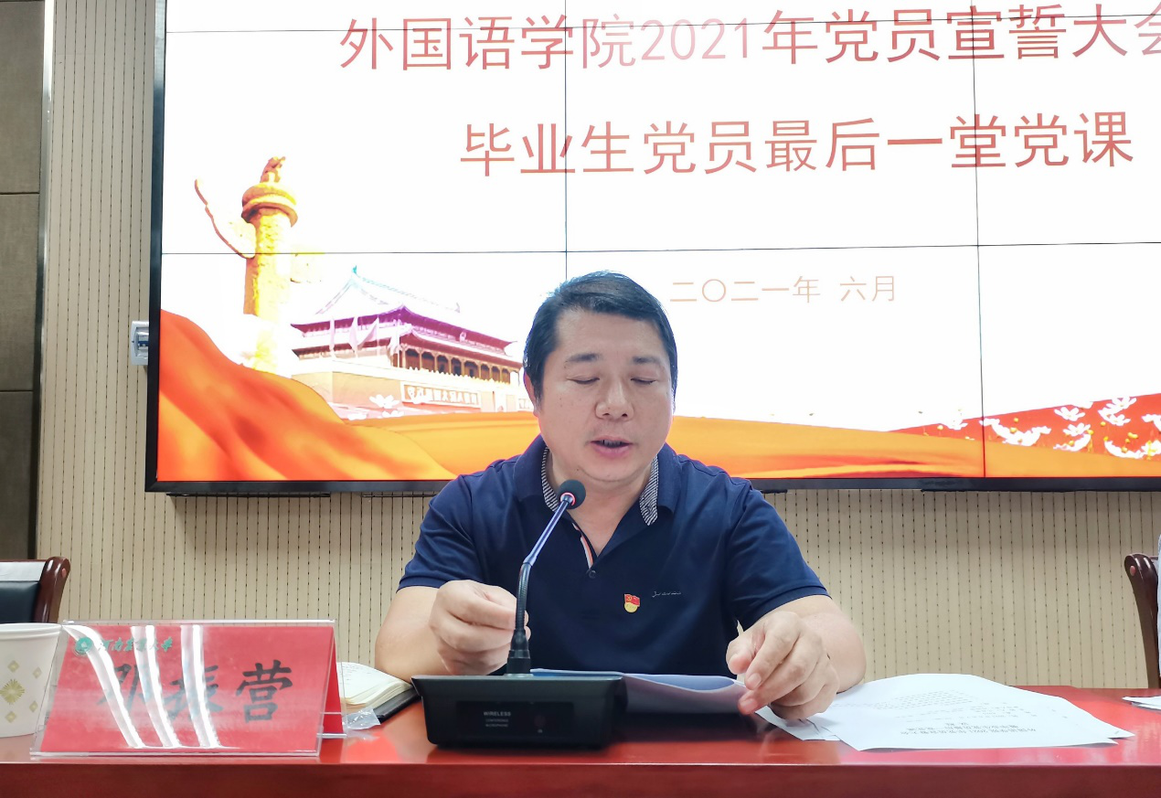 邓振营同志发表讲话并为毕业生党员讲授最后一堂党课。他指出,新党员入党宣誓,是入党的重要程序之一,也是一名党员政治生命开始的象征,体现了一个共产党人为实现人生最高价值所做出的无悔选择。希望大家永远记住这个神圣的时刻,牢记党的要求,在实际行动中践行党的誓言,努力做一名合格的共产党党员。他寄语广大学生党员,一要不断加强学习,努力提高自身能力;二要自觉接受党组织的教育、管理和监督,不断加强党性修养;三要时刻牢记党员身份,充分发挥模范作用。他要求,广大党员要学党史、感党恩、听党话、跟党走,不忘初心、牢记誓言,以坚定的信念、执着的追求,在为新发展阶段中原更加出彩、农大更加辉煌谱写绚丽篇章!