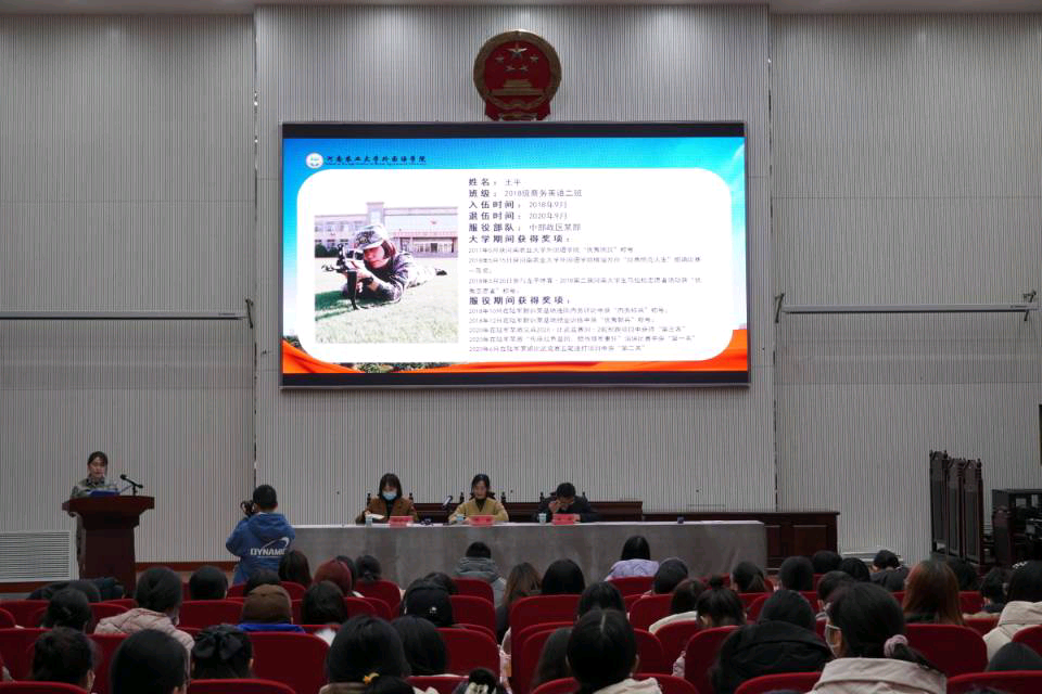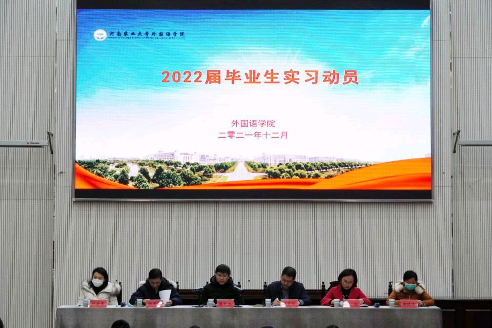 本网讯(审稿:冯超 供稿:黄湘)12月28日下午,学院于龙子湖校区繁塔楼大教室三召开“2022届毕业生实习、征兵入伍动员暨就业创业工作启动大会”。院长张俊杰、院党委副书记王启佩、副院长张卫东、英语系主任宋扬、日语系主任邱丽君、院党政办主任郝晓峰、院团委副书记陈桃、院团委副书记冯超、辅导员穆君怡携2022届全体毕业生出席了此次会议。