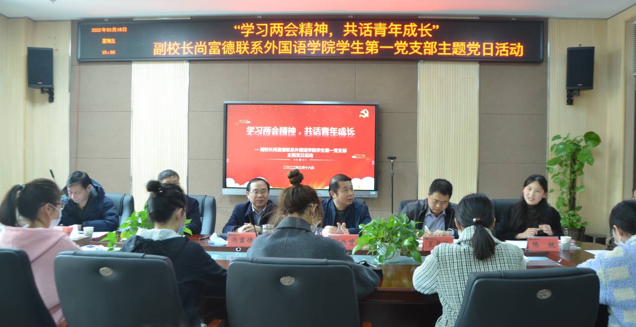期间,尚富德通过领学习近平总书记有关青年成长的重要论述、分享两会学习感悟、与与会师生座谈交流等方式把脉问诊支部学习效果,他指出,中华民族伟大复兴的中国梦必将在青年一代的接续奋斗中实现,并以此寄语请青年学生党员:一要志存高远,忠于党,忠于祖国,努力做有远大理想和坚定信念的爱国者;二要敢于担当,勇于奋斗,努力做新时代具有责任意识和创新精神的建设者;三要勤奋学习,锤炼身心,努力做新时代有过硬本领和高尚品格的接班人。