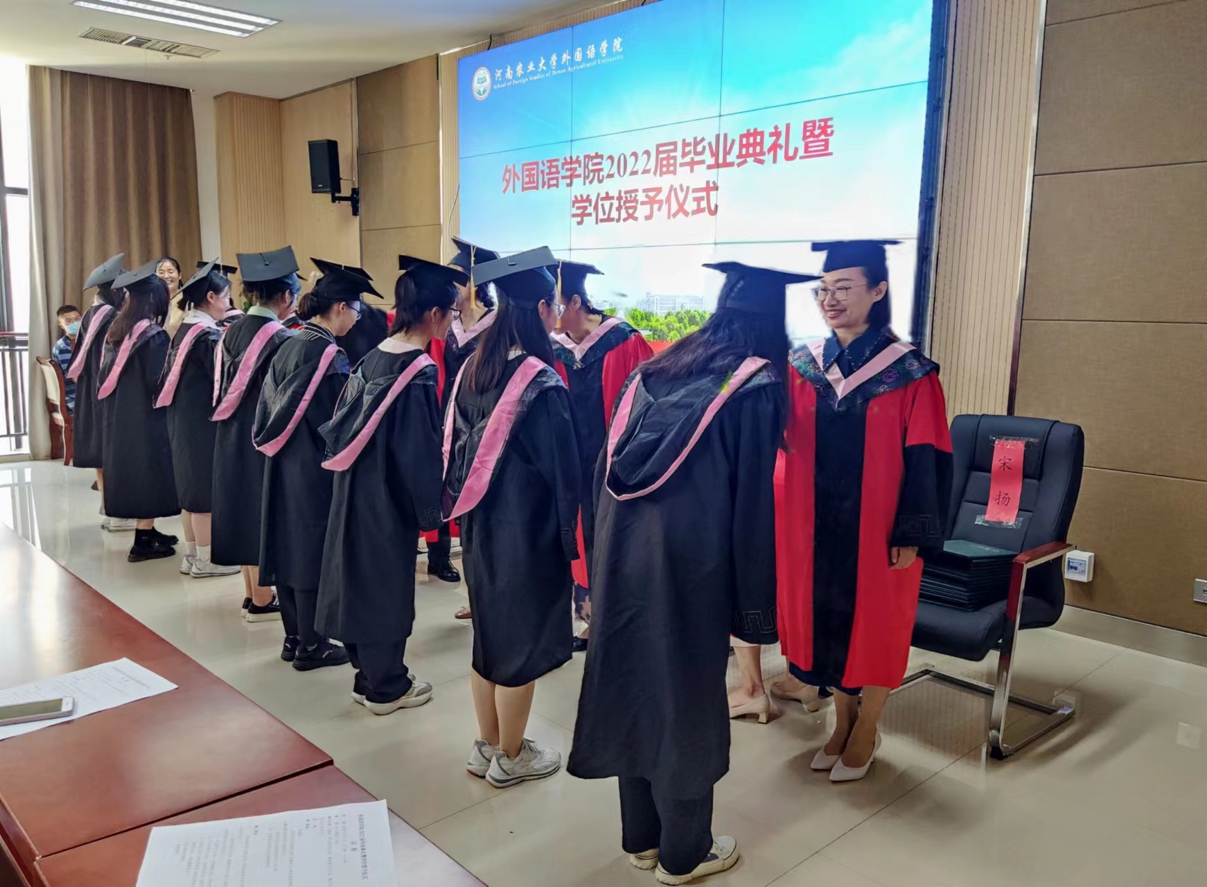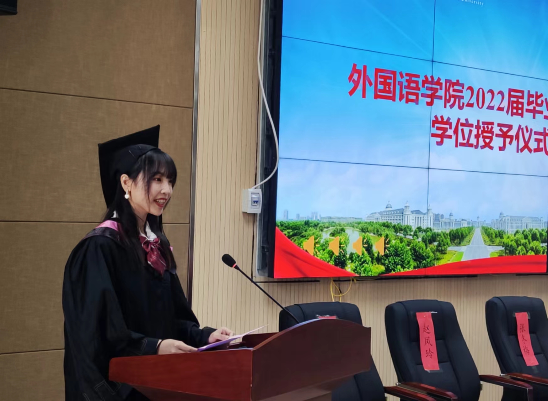 在仪式的第二阶段,院学位委员会代表以及教授委员会代表为2022届学位获得者学生代表扶正流苏并颁发学位证书。接着,毕业研究生、毕业本科生、在校生代表依次发言,表达了对母校的感谢之情,并表示未来将接过新时代事业接力棒,为实现第二个百年奋斗目标贡献所有的青春才智。陈洁作为教师代表进行发言,她希望同学们在今后的日子里继续传承并不断发扬外语学子自强不息、顽强拼搏、锐意进取、开拓创新的精神,继续以梦为马、不负韶华,策马扬鞭齐奋进,重整戎装再出发。