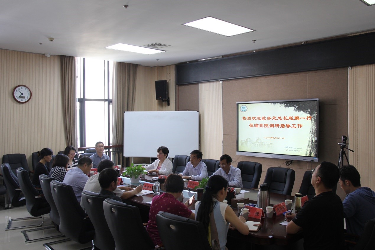 张俊杰对教务处各位领导莅临指导工作表示欢迎,并重点就学院语言实验室建设、设备现状、学院办学条件等情况进行了汇报。各系部室负责人结合系部实际情况,对教学日常管理、教师关怀、学生发展、教改项目推进、教学条件、外语角建设等情况进行了交流,针对教学运行中发现的问题提出建设性意见和建议。