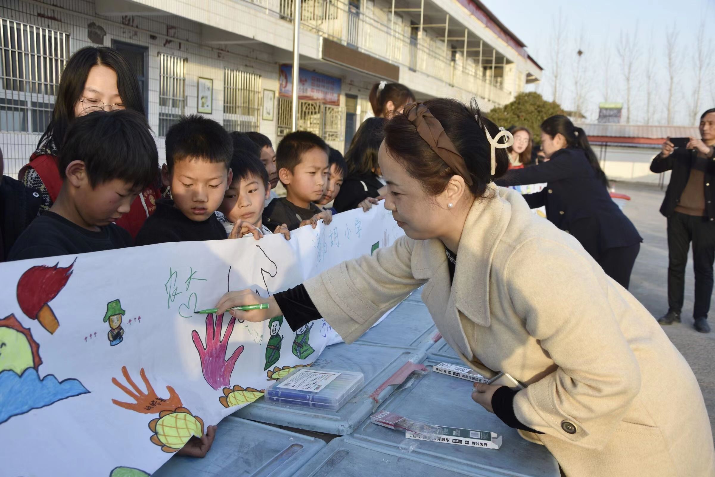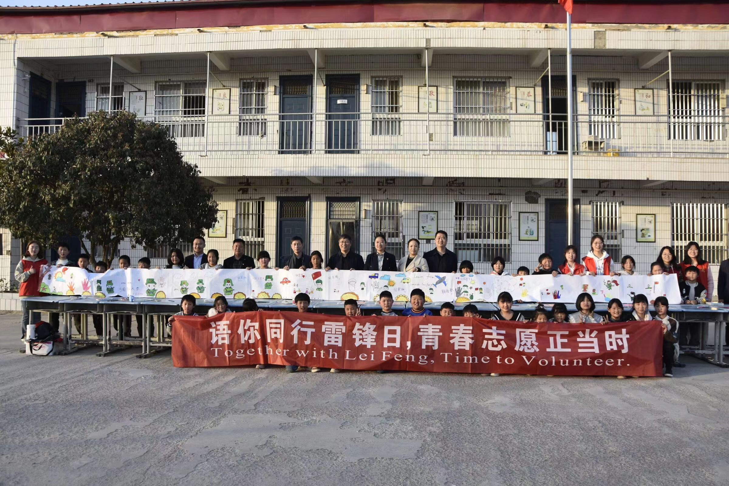 在潘店湖小学,师生志愿者们依托自身专业特色,为小朋友们开设了“说雷锋、唱雷锋、画雷锋”雷锋主题小课堂,他们带领小朋友们一起用外语讲述雷锋故事,传播雷锋精神,共同演唱歌曲《学习雷锋好榜样》。
