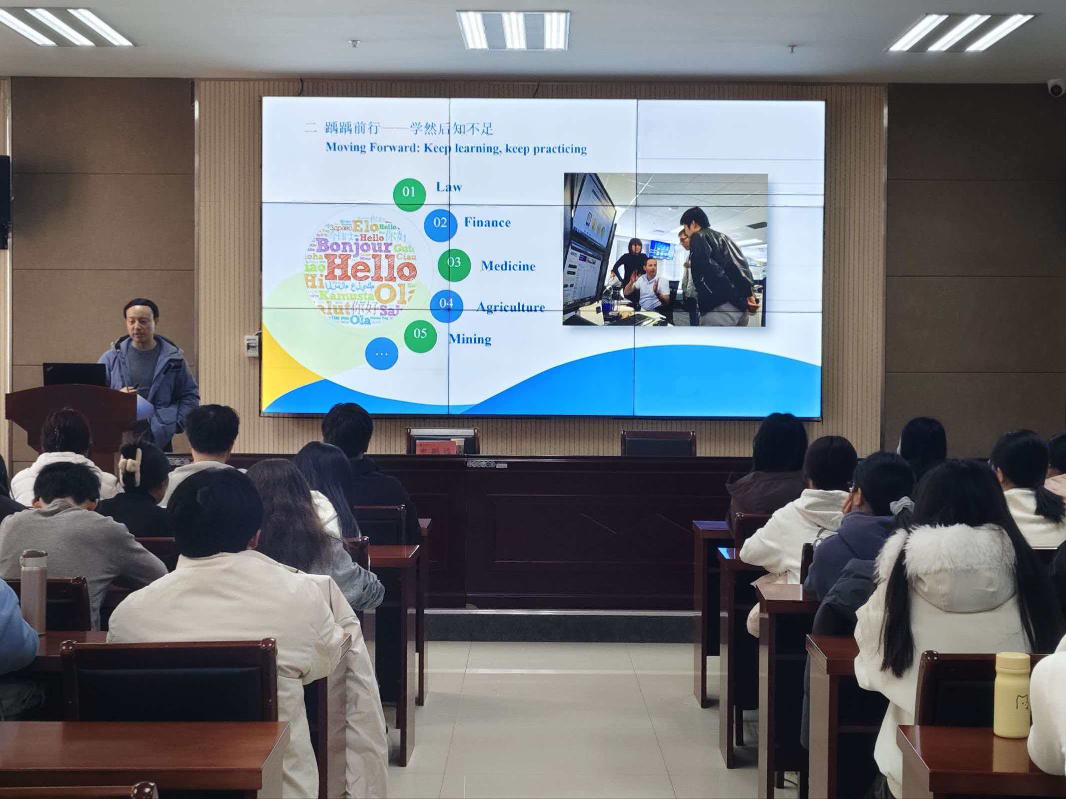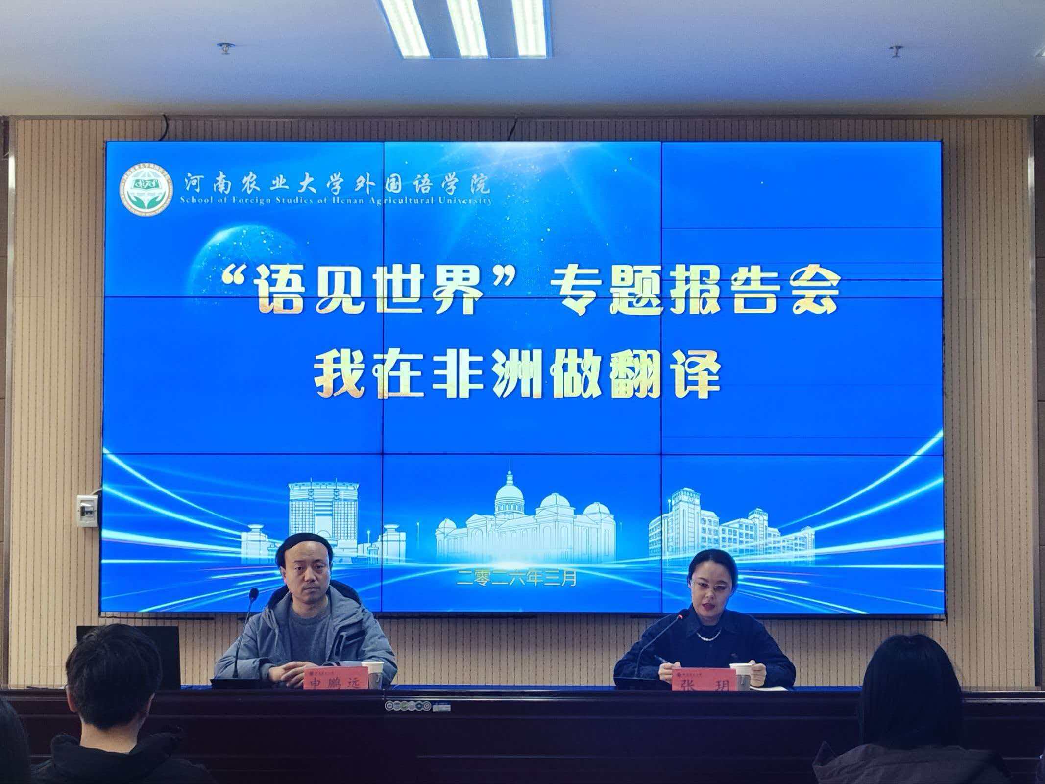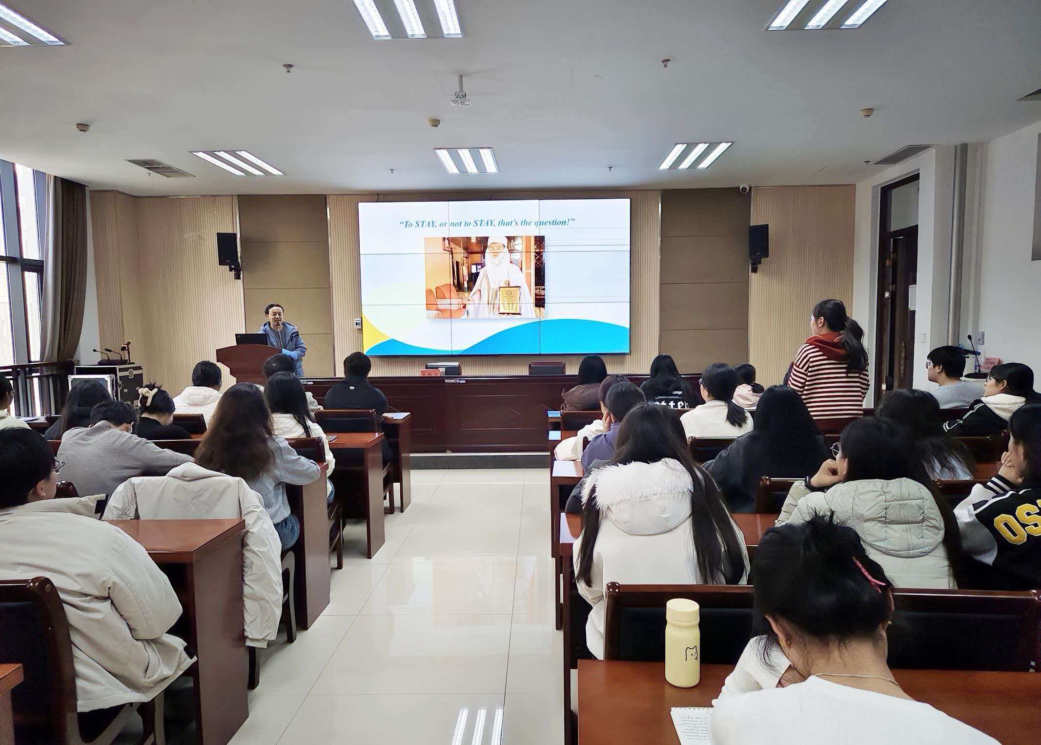 于繁塔楼A324举办“语见世界”专题报告会第一期《我在非洲做翻译》。本次活动特邀上海外国语大学校友申鹏远老师担任主讲,院党委副书记张玥主持,全体学生参加报告会。