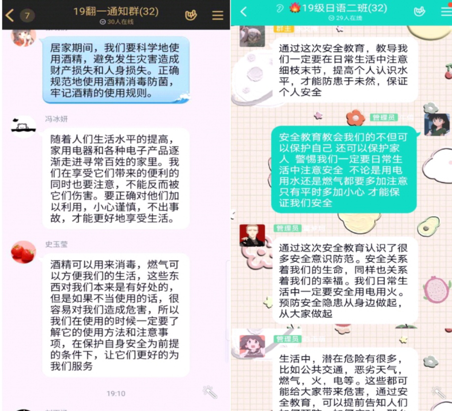 期间,各班心理委员就防火防盗防诈骗及如何正确使用酒精消毒等问题做了详细讲解。他们通过例举真实案例,让学生了解常见的诈骗手段,提高防骗意识,增强防范能力。同时,心委们强调:在使用酒精消毒时,要保持室内通风,远离高温物体,不与明火接触。直接用酒精擦拭门把手、桌面、电梯按钮时,不要大量喷洒于空气中或身体上。随后,心委分享相关链接至班群让学生观看学习,并组织学生展开了一场热烈的安全知识分享与讨论。学生们纷纷表示:“安全大于天”,为避免意外安全事故发生,一定要树立高度安全意识,切实做到警于思、合于规、慎于行,才能真正保障自己的人身安全。