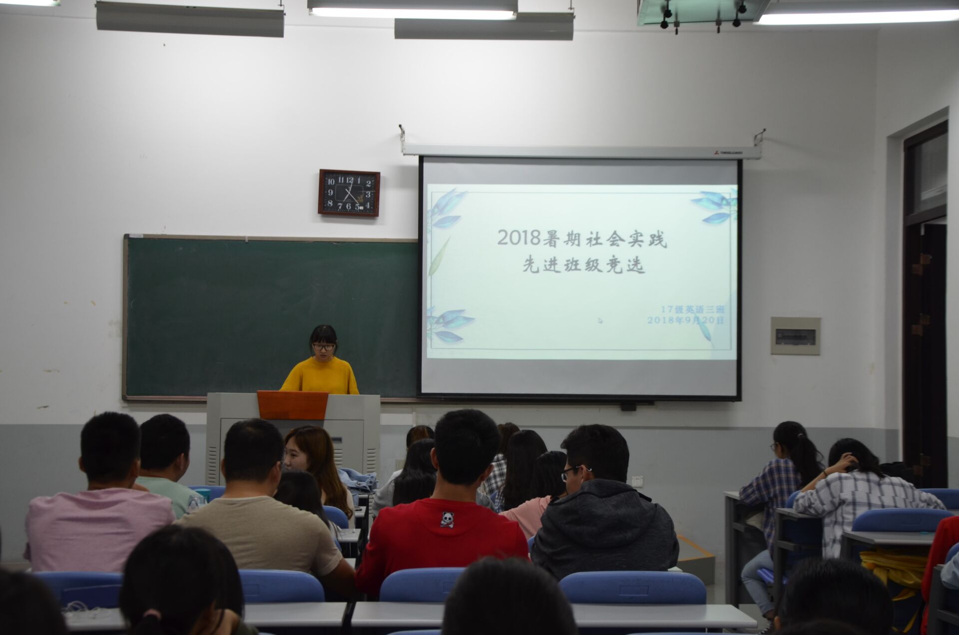 会上,参选班级从项目内容、项目成果、项目宣传效果等方面对暑期社会实践进行了展示。各个班级分享了社会实践的具体经过以及在实践过程中收获的感动,并通过视频、图片等形式展现了实践过程的艰辛。其中,17级商务英语一班通过组织开展“访古迹、忆往昔、扬精神”暑期社会实践活动,使二七铁路工人罢工运动的史实更加深入人心;17级英语四班组成“逐梦盛夏”团队,在这个暑假为南阳的孩子送去最好的礼物;17级英语三班远赴北阳等地,在艰苦的环境中用爱为孩子们撑起知识的绿阴。