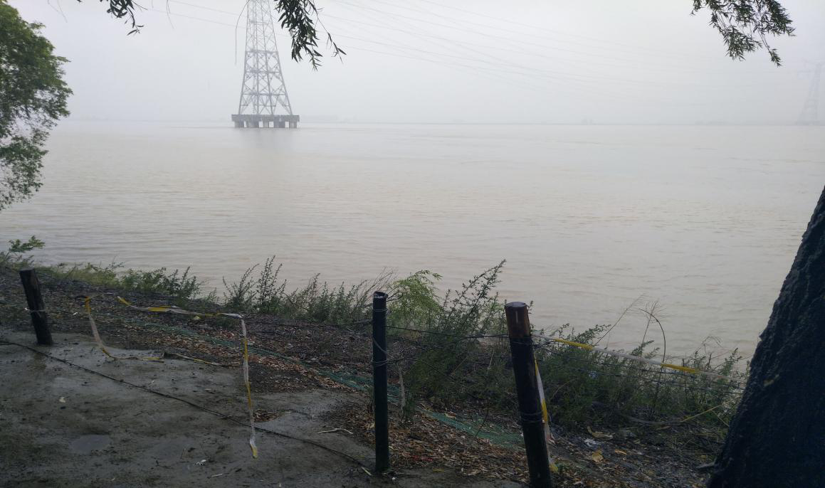 经过一段步行,终于看到了黄河。因当天下雨,项目没有开放,队员只能在河边观察黄河的水流,无法乘坐汽艇到黄河上感受河水的湍急。从岸边向河中心望去,能很明显看到一条分界线。分界线一边水为黄色,一边颜色较清。由此便可感知到黄河看似平静的水下实则暗流涌动,黄沙翻滚。