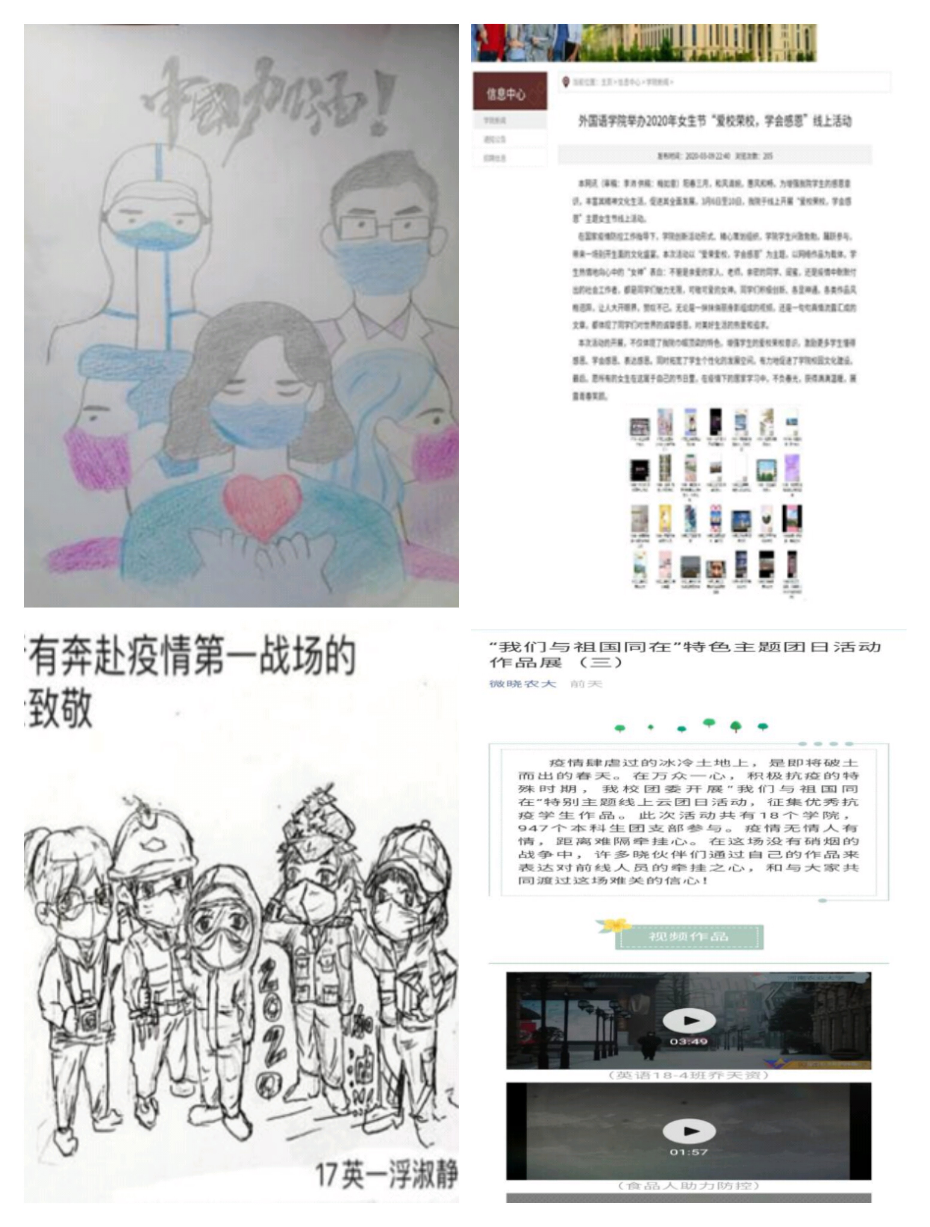 学院在坚持进行线上团日活动、主题班会和班长支书例会的同时,更积极创新网络活动、丰富学生们的精神文化生活。其中包括“学雷锋、抗疫情”主题活动,通过征集有关雷锋精神的文稿及画作,进一步弘扬雷锋精神、致敬新时代雷锋精神传人;“爱校荣校,学会感恩”特色女生节作品征集活动,以“说感恩之语、怀感恩之情、做感恩之事”为主题,传递了感恩思想、升华了爱校感怀,鼓励学生成为凝聚学校发展的蓬勃力量;更有以“我们与祖国同在”为主题的作品征集活动,同学们通过书写文章、画手抄报、录制小视频等多个形式表达了要与祖国共进退、与全国人民一条心,共克时艰、战胜“疫情”的信念与决心。其中,同学们的优秀作品更是获得校、院新媒体平台推广宣传,取得良好宣传教育效果。
