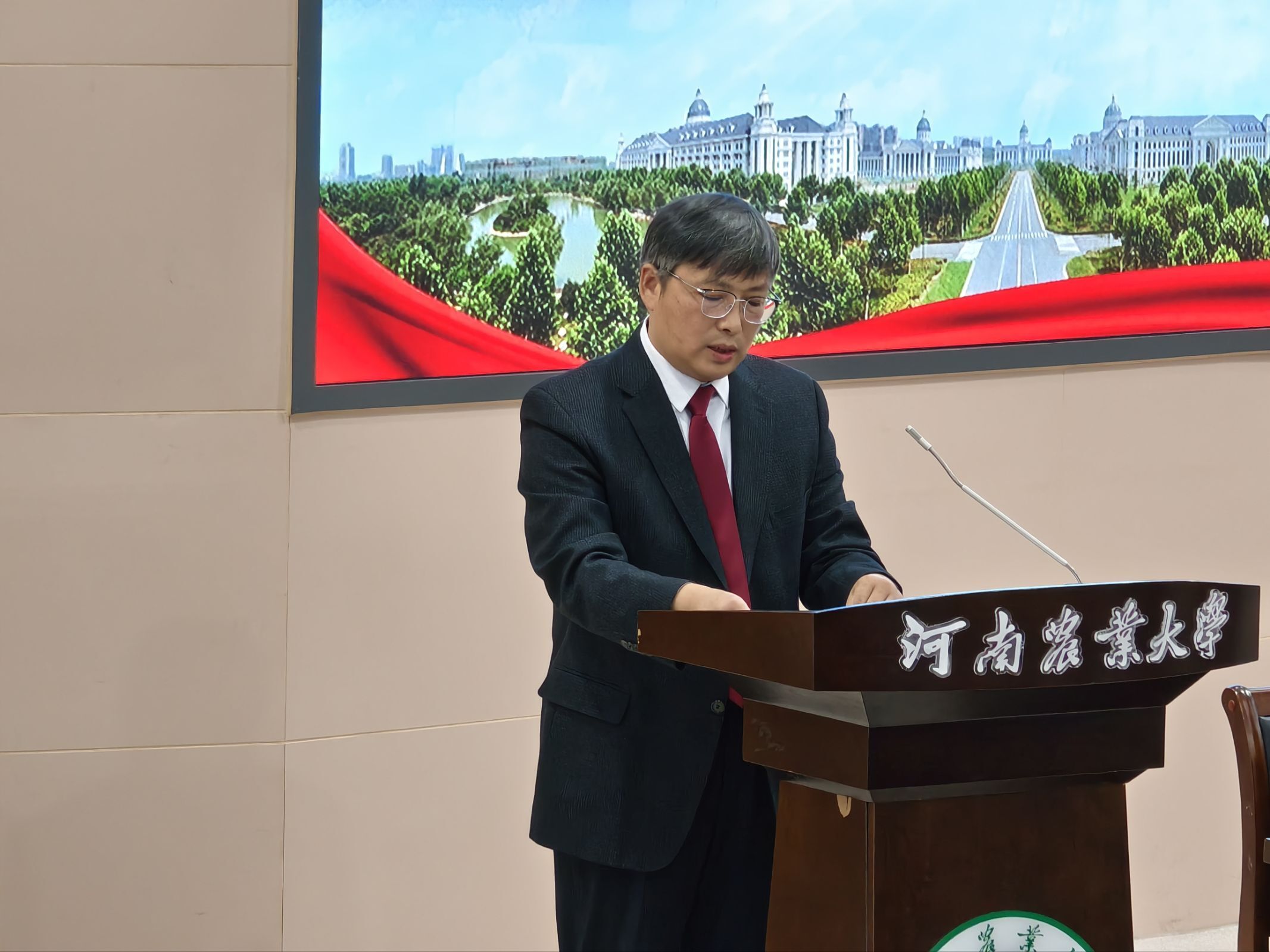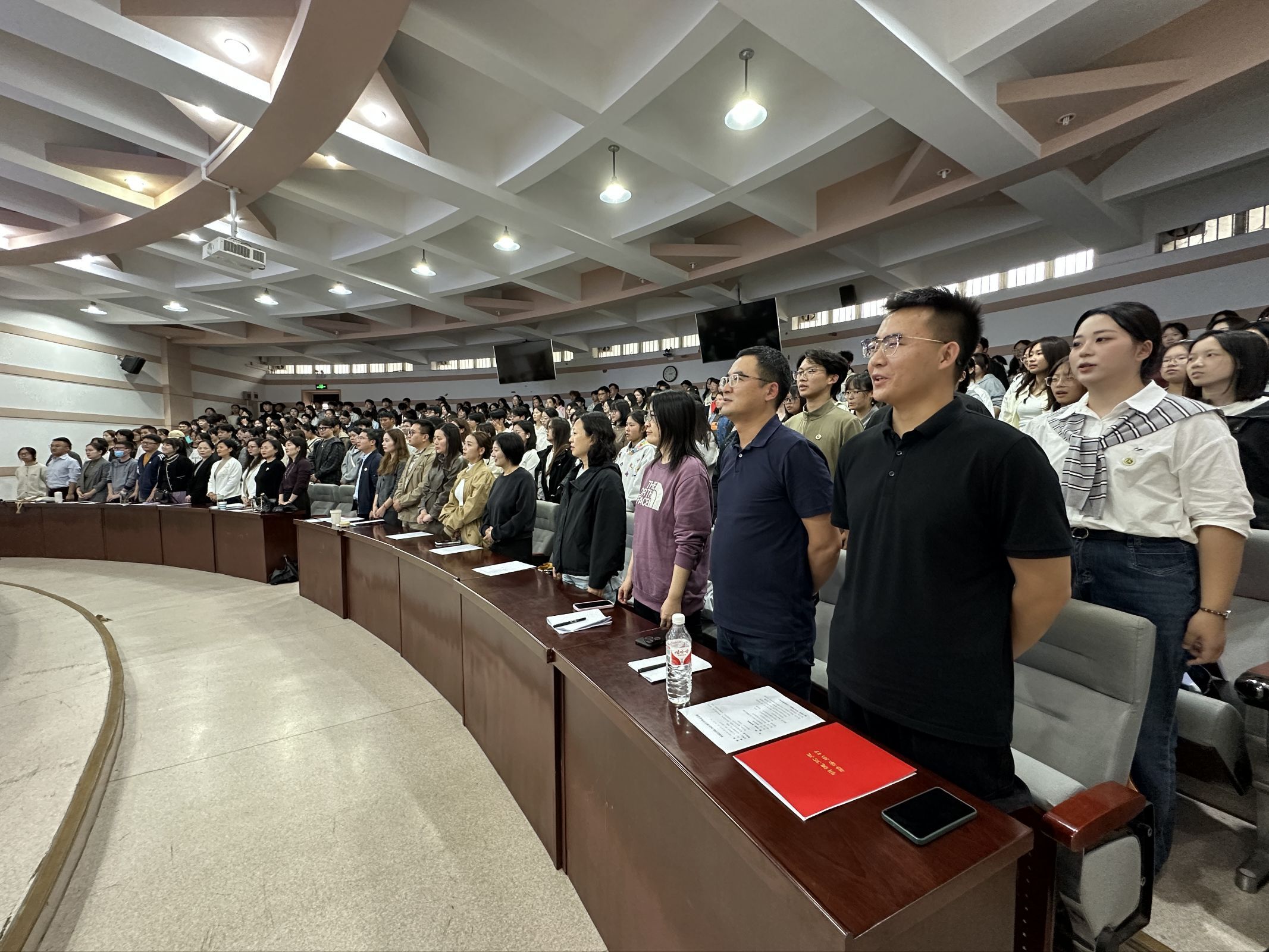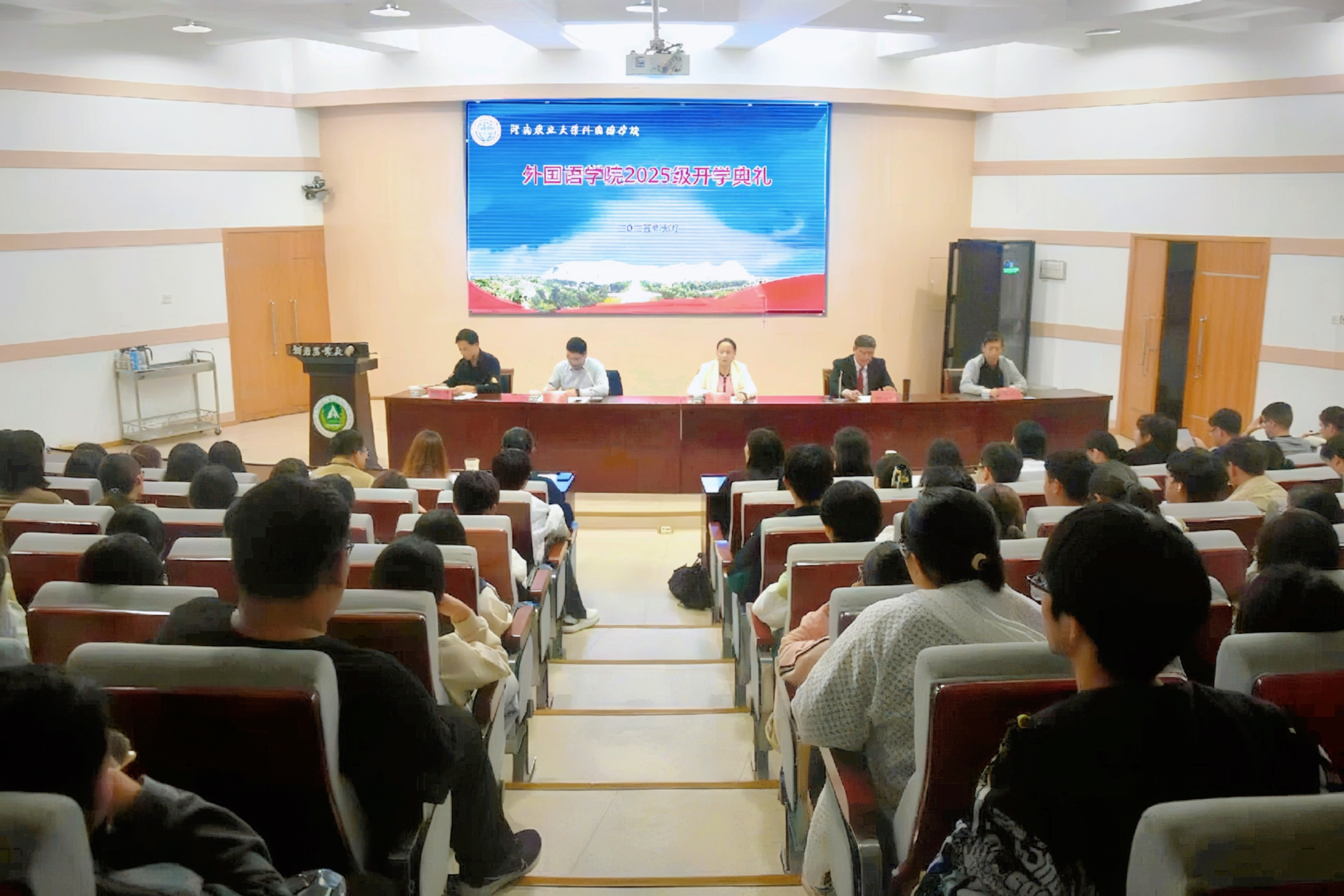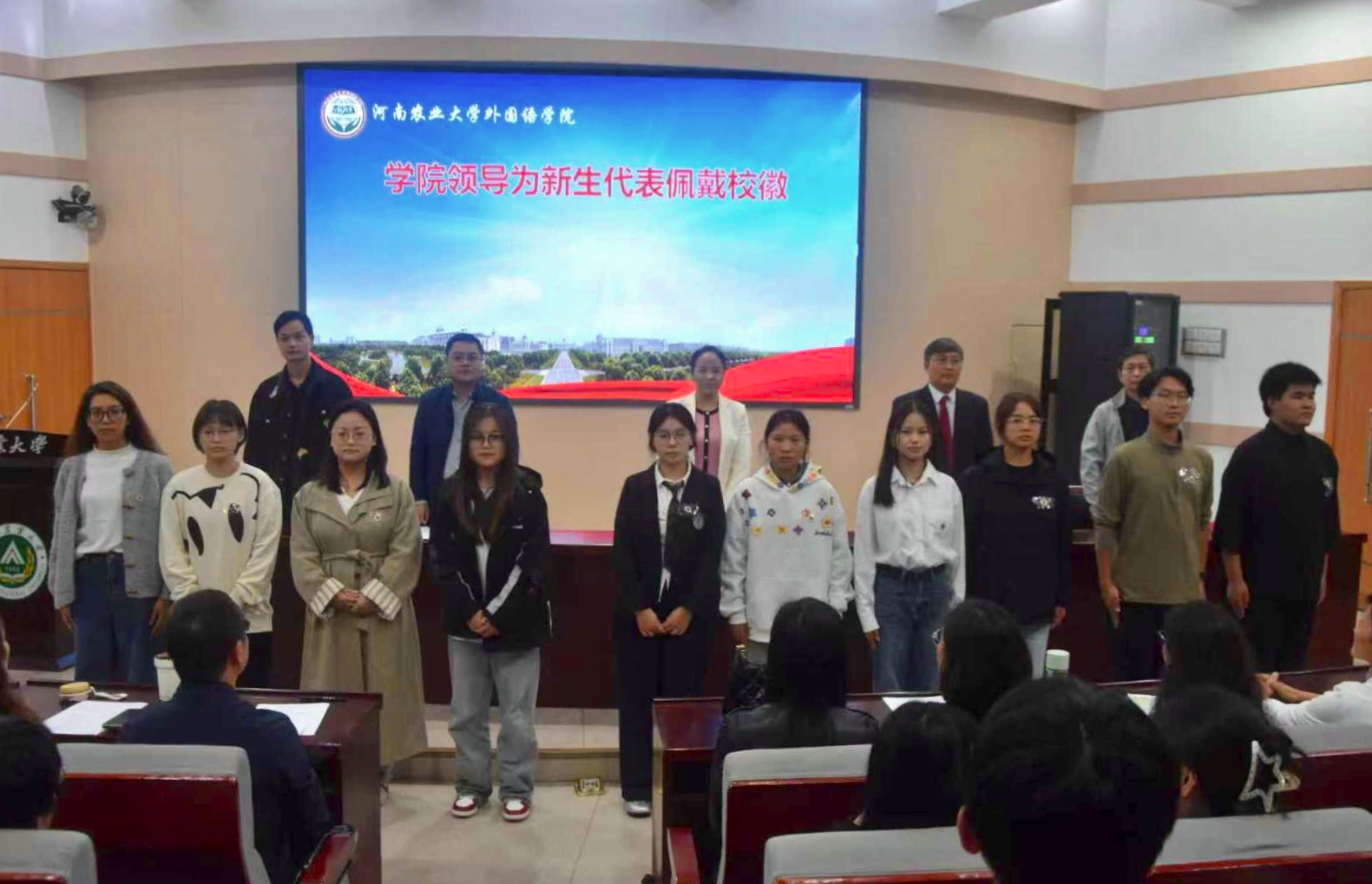 开学典礼在庄严的国歌声中拉开序幕。随后,学院领导为新生代表佩戴校徽,象征新生正式融入外院大家庭、开启学业新征程。