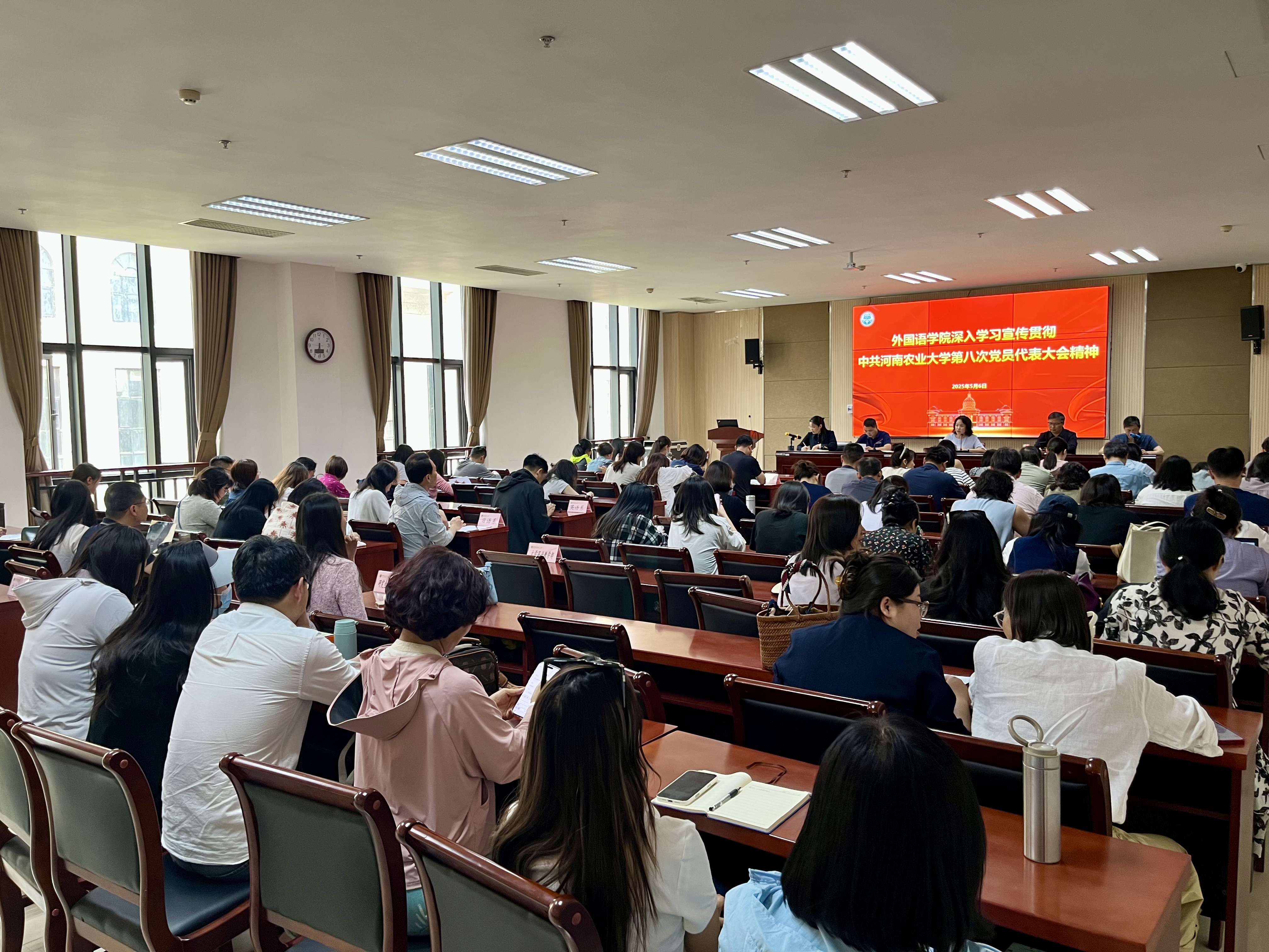 王燕萍传达了学校第八次党代会的召开盛况,领学了校党委书记岳杰勇在党代会上作的题为《凝心聚力攻坚 融合创新发展 全面开启中国特色世界一流农业大学创建新征程》的报告。王燕萍详细解读了大会主题、七次党代会以来的成就、当前学校所处的历史方位、“三步走”战略构想、三大发展共识、未来五年学校发展的指导思想和建设“十个一流体系”等内容。
