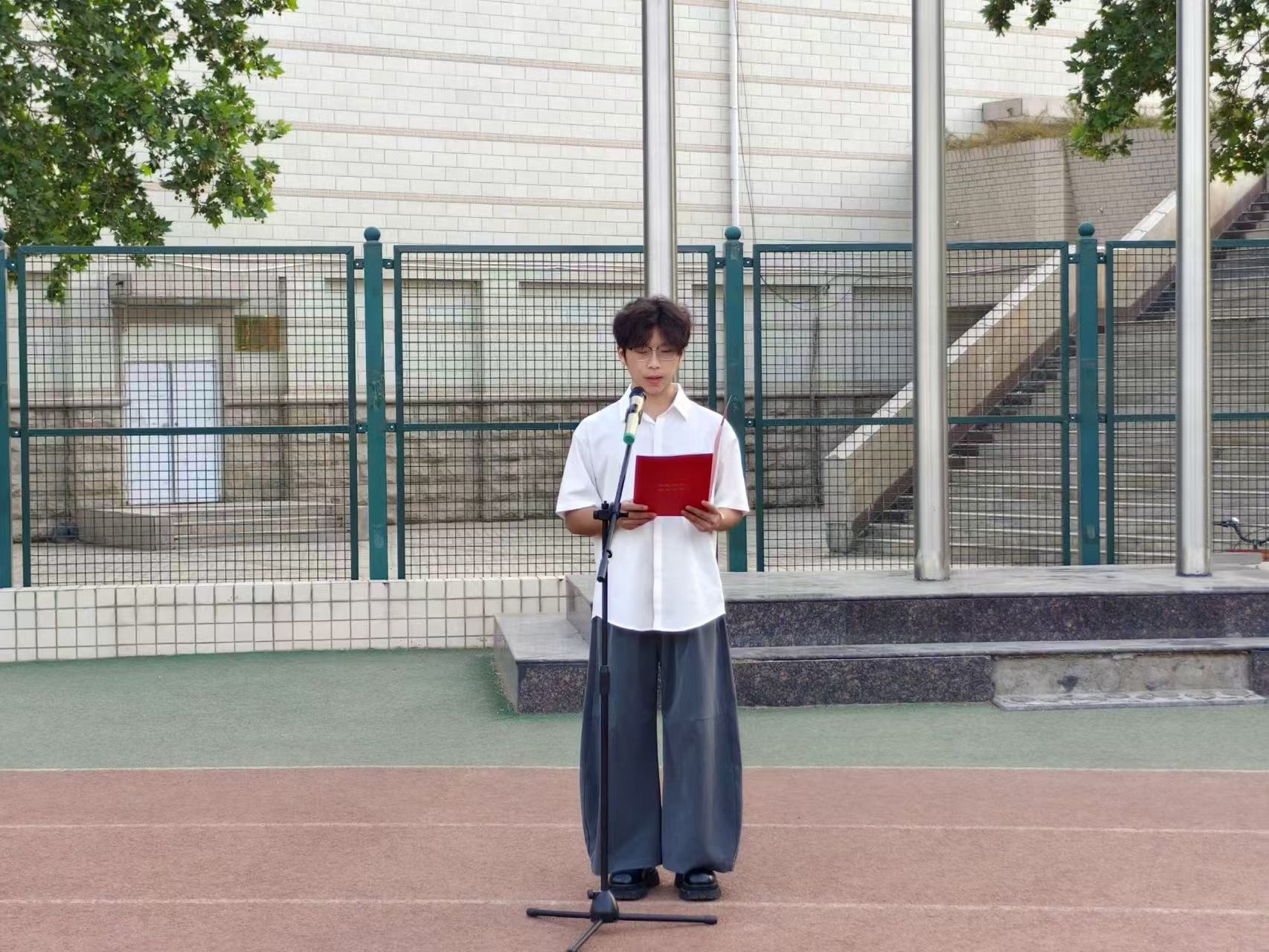 学生代表24级日语二班本科生朱振宇以《我和我的农大——外语学子梦》为题进行了国旗下的演讲,他回顾过往,分享了自己和农大之间的故事,号召外语学子以能力为起点,以国情为坐标,用外语讲好中国故事。最后,伴随着学生代表带来的双语朗诵《大国之音》,本次升旗仪式圆满结束。