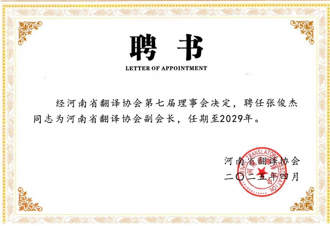 院长张俊杰教授受聘为河南省翻译协会副会长。
