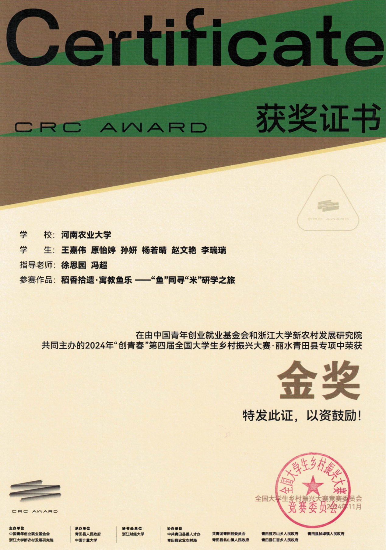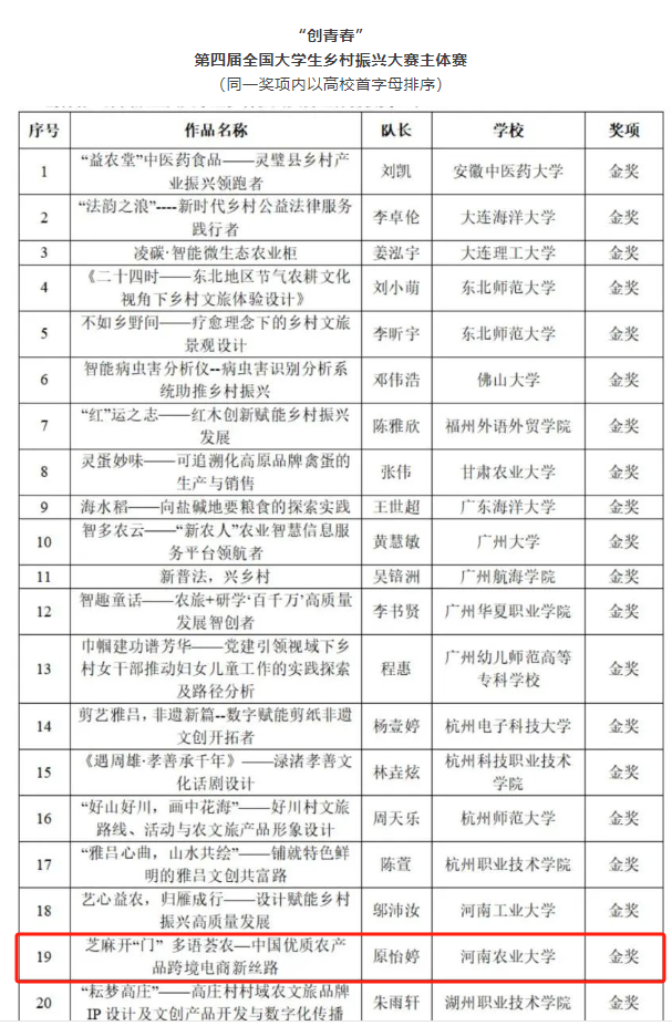自2024年6月赛题公布以来,学院高度重视、积极筹备、广泛动员、精心组织,各参赛队伍全力以赴,充分利用周末和暑期,深入乡村一线,将理论与实践结合,专业与创新创业融合,为乡村找问题、出创意、做方案,积极推动语言赋能、文化创意在乡村振兴中的重要作用。最终,柴奇、冯超老师指导的《芝麻开“门” 多语荟农——中国优质农产品跨境电商新丝路》项目在主体赛中荣获国赛金奖,徐思园、冯超老师指导的《稻香拾遗·寓教鱼乐——“鱼”同寻“米”研学之旅》项目在丽水青田县专项赛中荣获国赛金奖。
