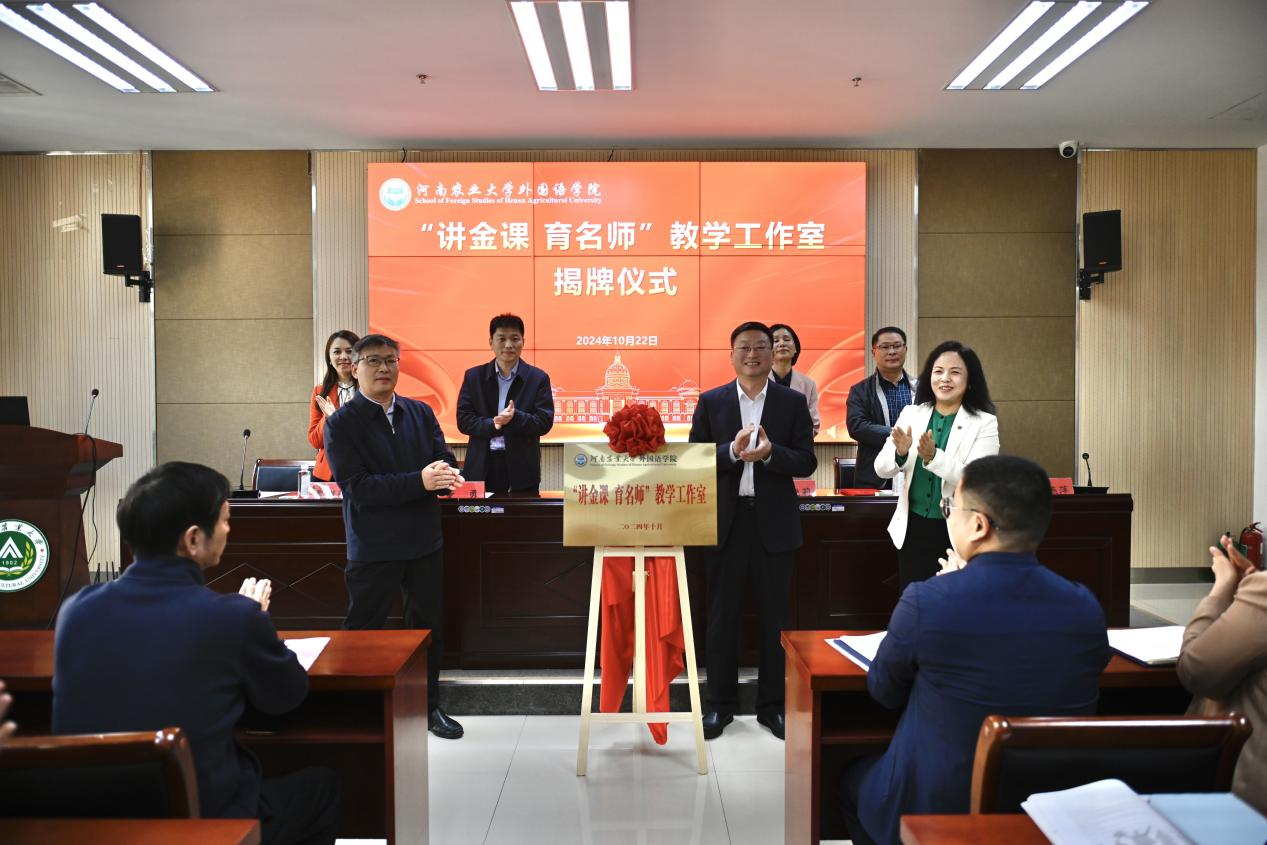 何松林和王燕萍、张俊杰共同为“讲金课,育名师”教学工作室揭牌,宣告工作室正式成立,一起为工作室成员代表颁发聘书,并合影留念。