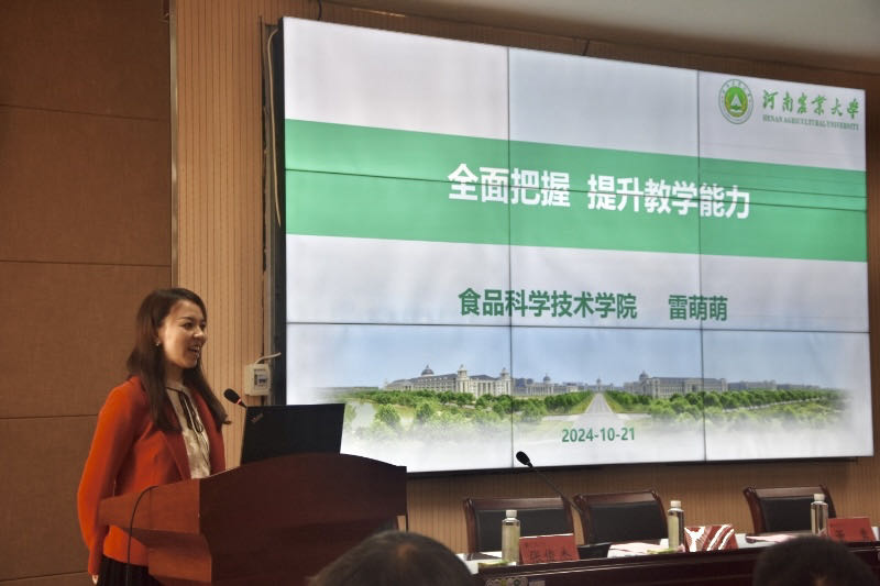 揭牌仪式之后,食品科学与技术学院雷萌萌老师做辅导报告,报告的主题是:全面把握,提升教师教学能力。雷萌萌与大家坦诚详尽地交流分享她在全国高校青年教师教学竞赛、河南省教育系统教学技能竞赛、河南省课堂教学创新大赛等各级各类大赛备赛、参赛的经验与心得,并聚焦于教学设计原则,从政策引领、教学理念、教学重难点、教学模式与方法等方面提出建议,为在场教师指明提升教师素养的方向和开展教学创新的思路。报告内容丰富详实,既有理论深度,又有实际案例,现场反响热烈,与会教师深受启发。