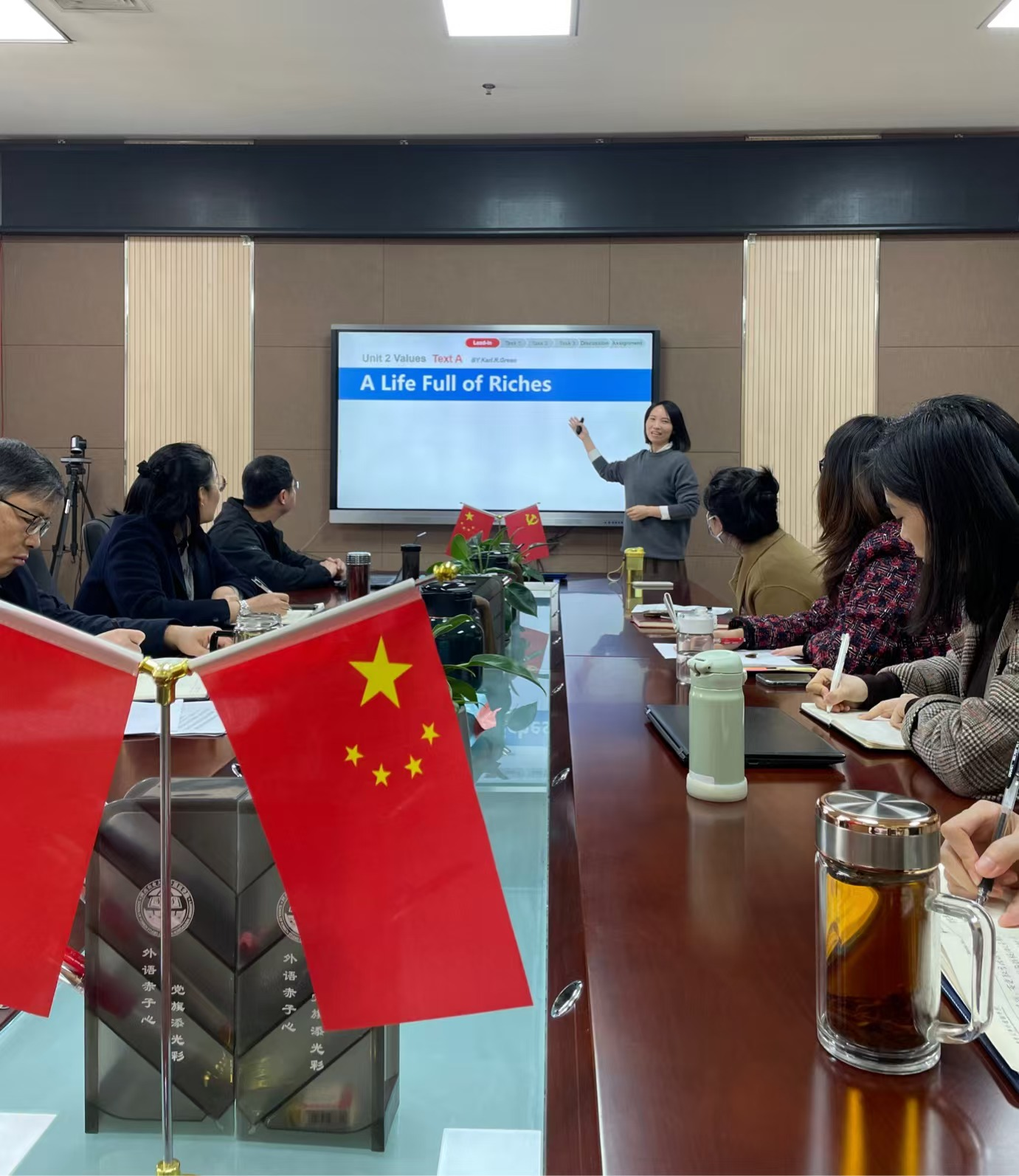 为授课内容,开始教学示范。凭借着扎实的专业功底、娴熟的教学技巧和极有感染力的表情和肢体语言,马瑶为大家呈现了一场教学盛宴。她深挖文章主题,积极引导参会的教师代表与其问答互动,结合众多论据层层深入地探讨了本文中富有(Riches)的意义,即物质的富足并不是人生充实的要件,精神的富有才是。紧接着,马瑶引入了《论语》中孔子对其弟子颜回的高度评价,盛赞了颜回安贫乐道的人生态度,中西文化在至高的精神追求上遥相呼应,非常自然流畅地切入价值观的引导和思政教育。鲜活的实例、巧妙的融入,让参会教师大呼精彩!