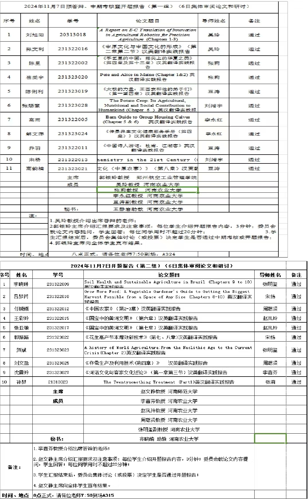 本网讯(审稿:吴 玲 ;供稿:马孝幸;摄影:马孝幸 齐晓萌 王静岩)11月6-7日,哔咔漫画 组织开展了2024年英语笔译专业研究生学位论文开题报告及预答辩、中期考核论证会。本次论证会特邀河南师范大学赵文静教授、河南财经政法大学孙建华教授和郑州航空工业管理学院郭银玲教授分别担任论证小组主席,哔咔漫画 硕士生导师担任委员,2名研究生参加预答辩、中期考核和29名23级研究生参加开题答辩;24级研究生旁听了此次论证会。