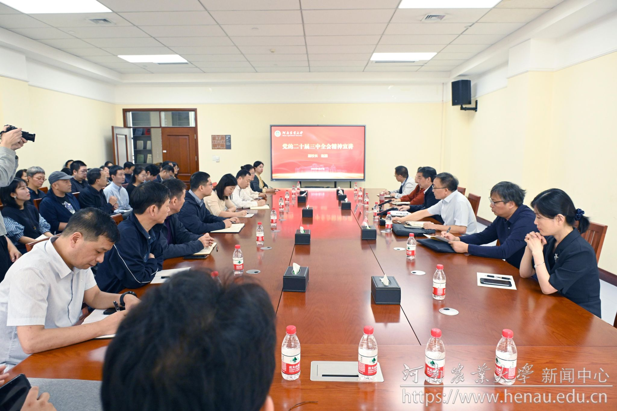 宣讲会上,赵鹏以“进一步全面深化改革,推进中国式现代化”为题,从深入学习领会习近平总书记在党的二十届三中全会上的重要讲话精神、学习贯彻习近平总书记在全国教育大会上的重要讲话精神、学校当前的形势与任务三个方面展开宣讲,深入浅出,高屋建瓴,特别是结合分管工作,从学校深化与中国农业科学院融合发展、推动教育教学改革、促进科教融汇、实现更高质量的产教融合等方面,与老师们进行面对面的交流与分享,为下一步如何提高本科教育教学质量指明了方向、提升了认知、启发了思想。