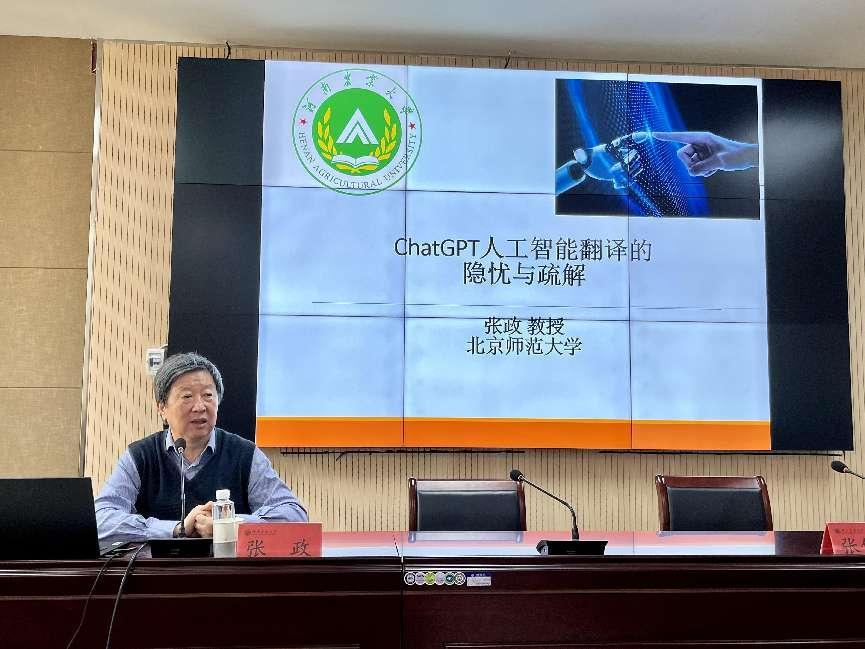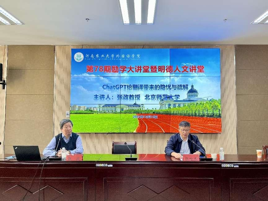 本网讯(审稿:吴 玲;供稿:马孝幸)10月16日上午北京师范大学张政教授、博士生导师应邀做客哔咔漫画 第78期励学大讲堂暨明德人文讲堂,做了题为“ChatGPT给翻译带来的隐忧与疏解”的报告会。报告会由院长张俊杰教授主持,哔咔漫画 师生参加了此次报告会。