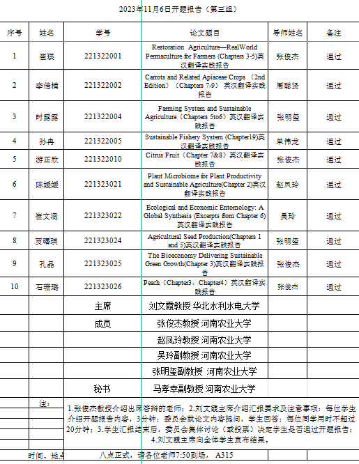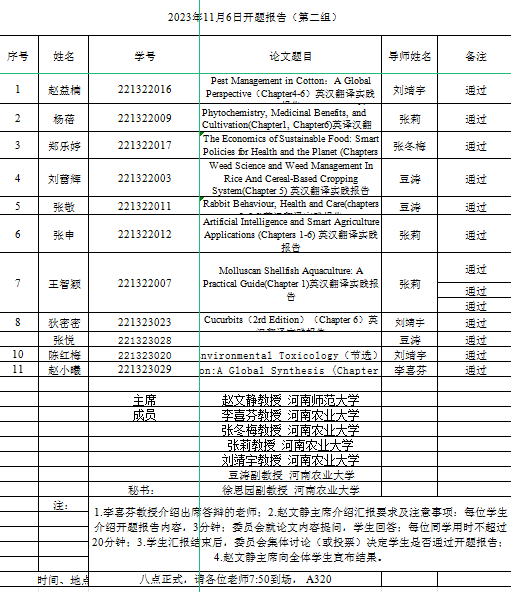 在繁塔楼A315、A320和A324教室顺利举行2022级英语笔译研究生毕业论文开题报告会。此次开题报告会特邀河南师范大学赵文静教授、华北水利水电大学刘文霞教授与李胜机教授担任委员会主席,全体硕士生导师担任委员。共有31名研究生参与本次毕业论文开题报告会,分为三个小组展开答辩。2023级研究生观摩旁听。