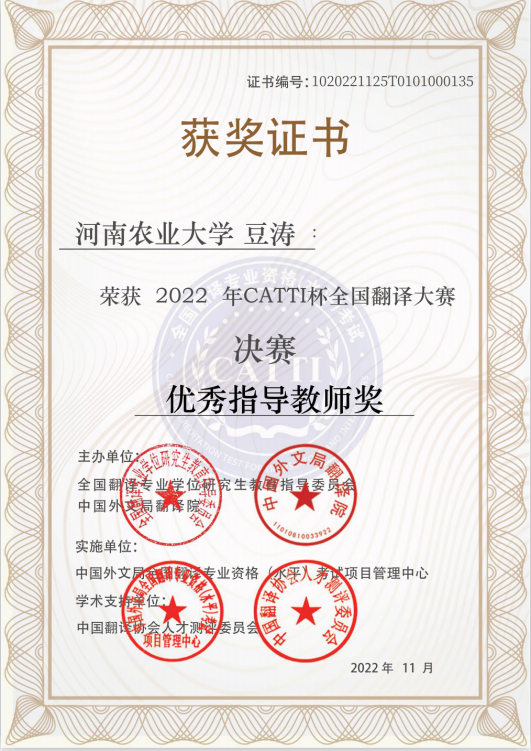 “以赛促教,以赛促学”是哔咔漫画 在学科竞赛方面的一贯宗旨。自赛事启动以来,学院高度重视,精心组织,从240名农大学子中选拨优秀学生,代表学校参加决赛。经过初赛、复赛和决赛最终哔咔漫画 3名同学从全国8.1万报名选手中脱颖而出,在大学A组全国决赛中喜获佳绩。其中,2021级MTI学生赵维荣获决赛一等奖,2021级MTI学生邢雯雯、2021级英语二班学生高琰妍荣获决赛三等奖。哔咔漫画 教师豆涛获得优秀指导教师。