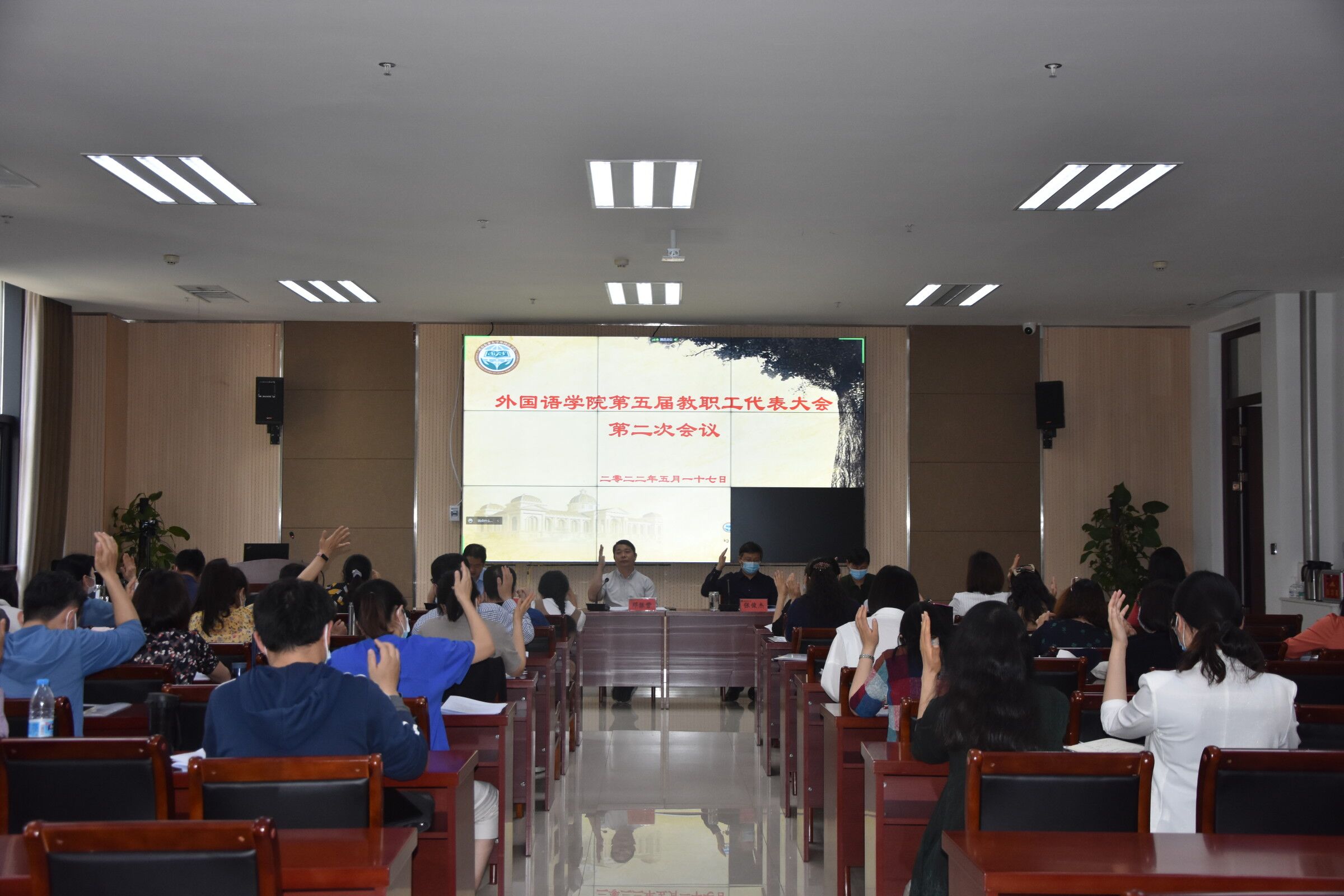 第五届教职工代表大会第二次会议于龙子湖校区繁塔楼A324会议室隆重召开。会议由院党委书记邓振营主持,院领导班子成员和全体教职工代表以线上线下相结合的方式参加本次会议。