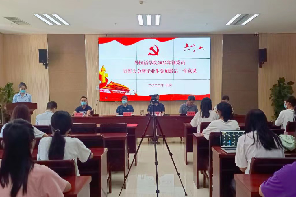 会议伊始,全体党员起立,奏唱国际歌。宣读张俊杰新发展党员名单,与会老师为新党员代表佩戴党徽。接着,陈桃作为领誓人带领全体党员重温入党誓词。党员同志面向党旗庄严宣誓,在铮铮誓言中他们重温入党初心,坚定理想信念,牢记职责使命。随后,毕业生党员代表和新发展党员代表依次发表感言。18级英语一班董开源对过去的学习生活进行了回顾总结,她强调,作为青年党员,我们应当积极承担历史和时代赋予的责任与使命,勤奋刻苦,积极进取,在磨练中锤炼过硬本领,在实践中勇于担当作为,努力成长为能够担当民族复兴大任的时代新人。20级英语一班于晓静表示未来将时刻用党的誓言来激励自己、鞭策自己,不断提高对党的伟大事业的责任感和自觉性,以严谨、务实、科学、求新的态度完成好自己的学业。