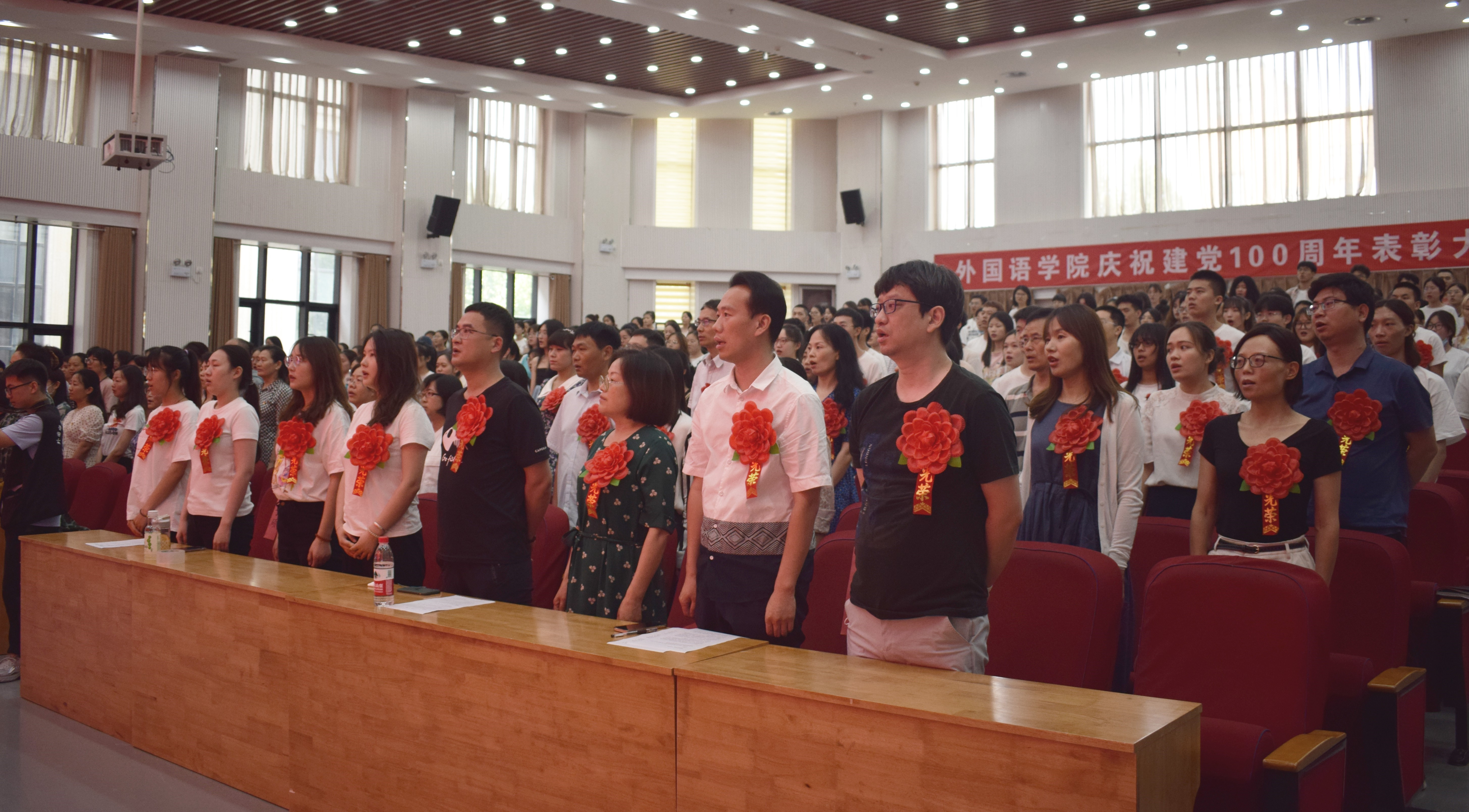 关于表彰2021年度先进集体和先进个人的决定》。在热烈的气氛中,院领导为受到表彰的先进集体和个人颁奖,向受表彰的师生表示衷心的祝贺,并肯定和赞扬了他们在工作和学习中的优异表现。随后,“优秀共产党员”教师代表余亮、“最美教师”代表柴奇、“优秀班主任”代表张建宇及“三好学生”代表18级日语二班张引倩分别发言,他们表示今后将再接再厉、立足本职、积极进取,共筑学院的新辉煌。接着,院党委书记邓振营带领全体党员们面对党旗庄严宣誓。