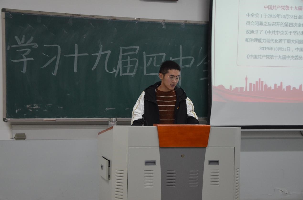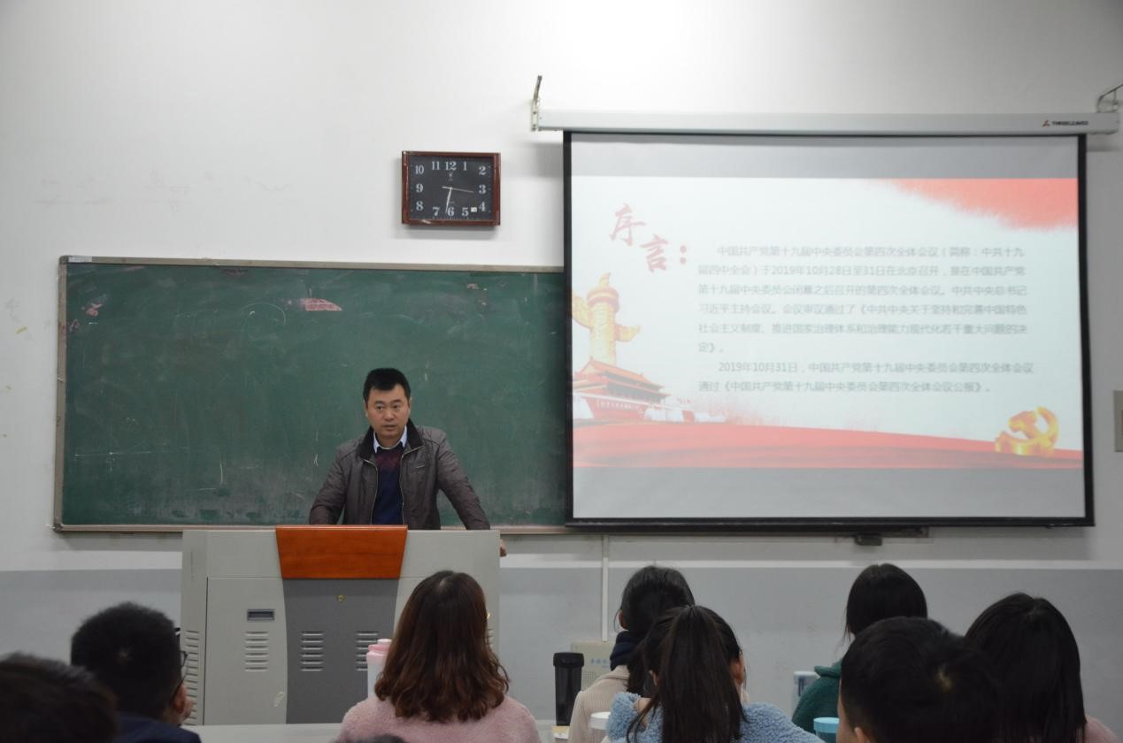 于龙子湖校区繁塔楼召开了以“聚焦十九届四中全会公报”为主题的十九届四中全会精神宣讲会。本次宣讲会由团委书记李沛、团委老师邓然、焦雪猛主讲。学院各班团支部委员聆听了宣讲会。