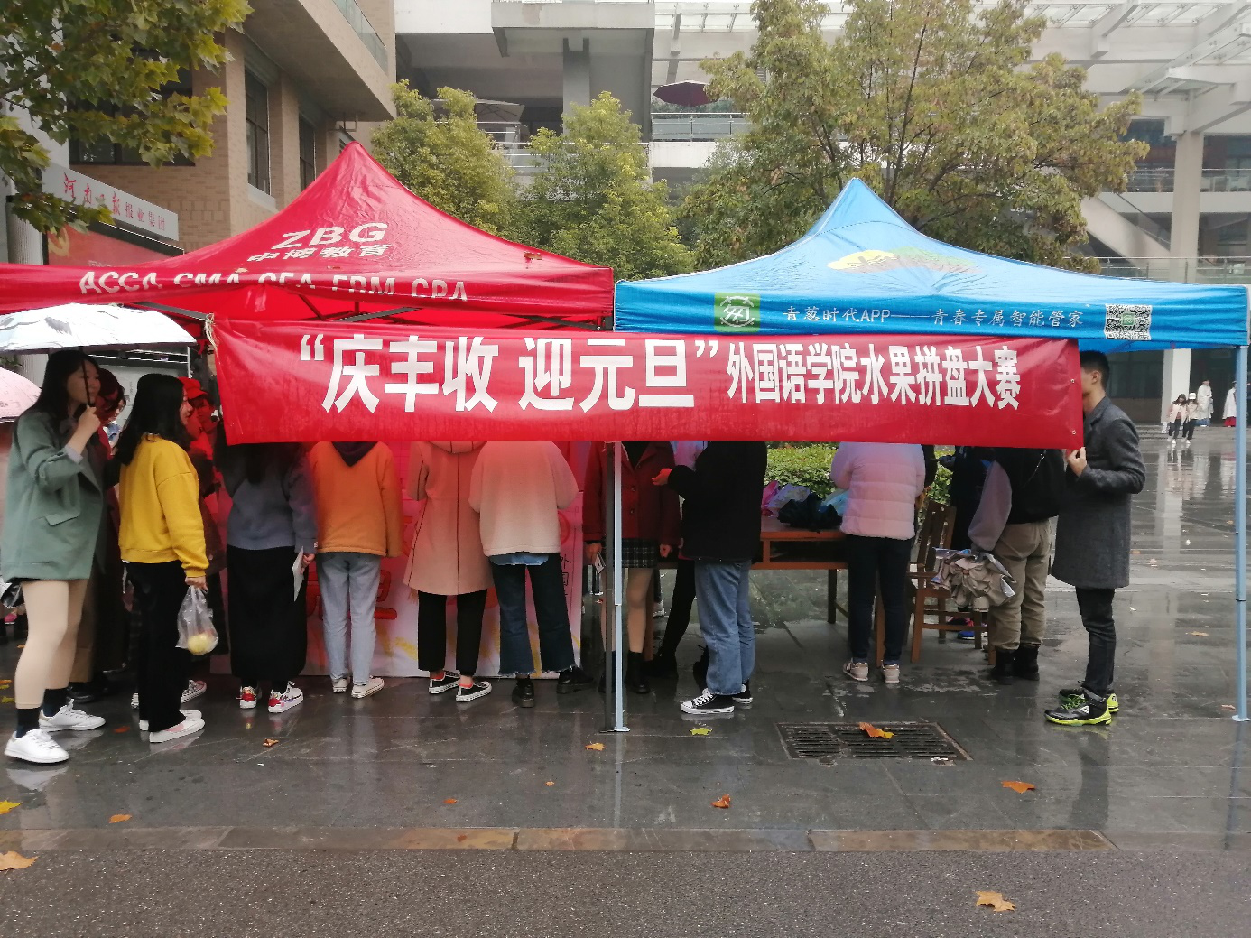 本网讯(审稿:李沛 供稿:张丹丹)为了丰富学生的课余生活,锻炼学生的团队意识,11月17日下午三点,学院于龙子湖校区一餐厅广场举办了以“庆丰收,迎元旦”为主题的水果拼盘大赛。此次大赛由哔咔漫画