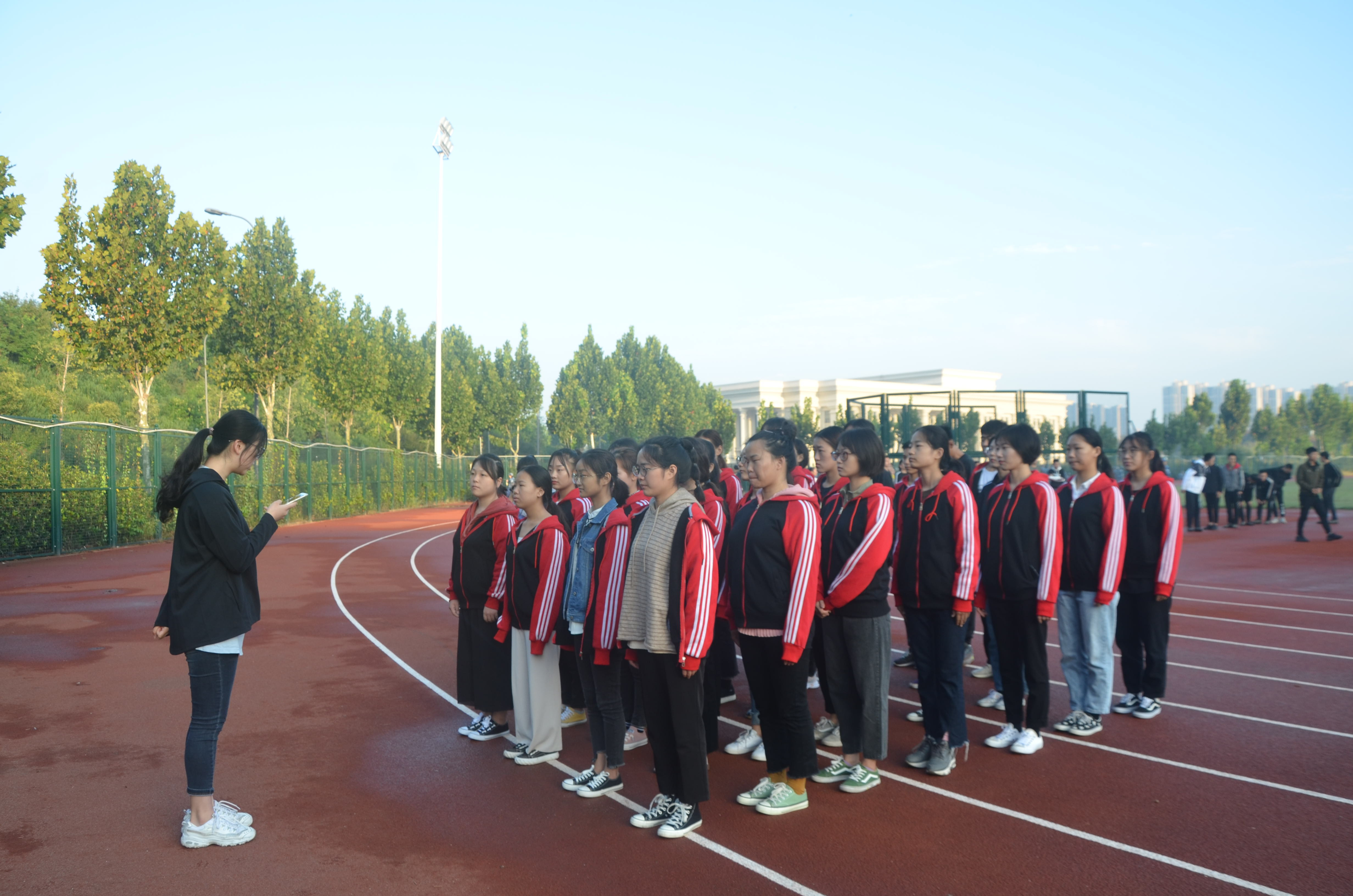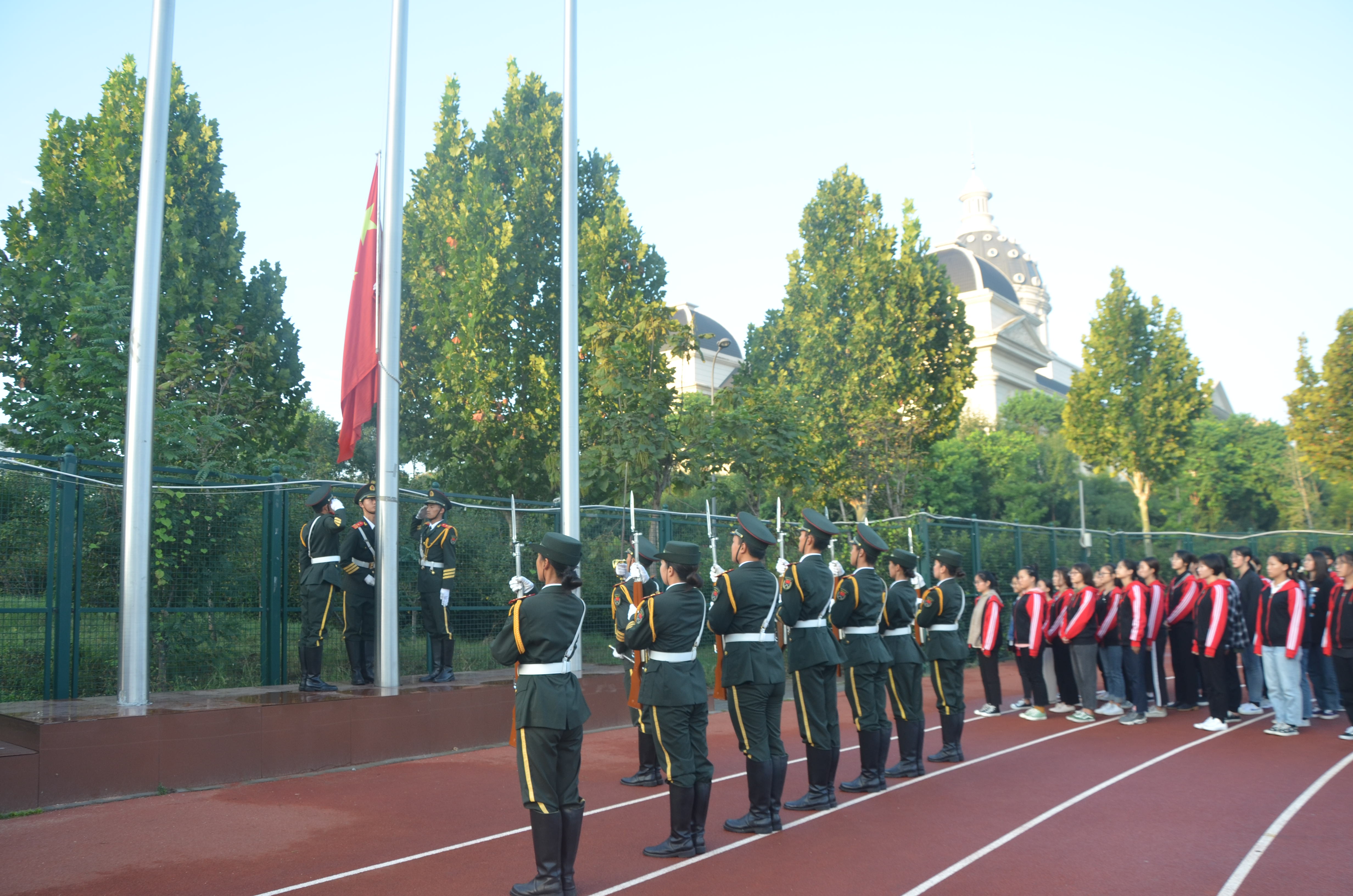 学生在龙子湖校区田径场举行升旗仪式。