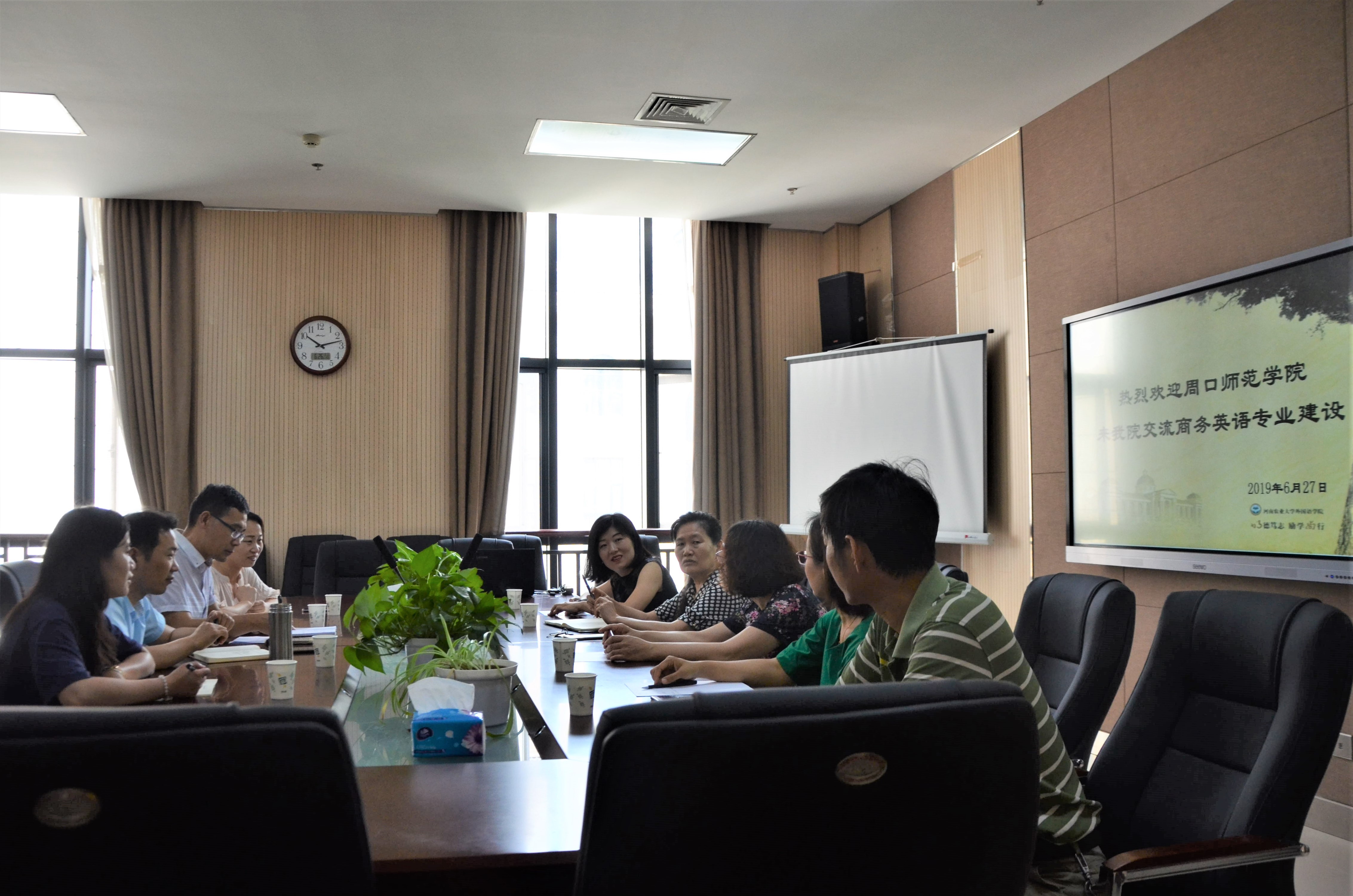 会议伊始,李喜芬对周口师范学院一行的到来表示了热烈欢迎。随后,双方简要介绍各自的办学历程、办学特色、应用型人才培养模式改革以及近年来商务英语专业的发展情况。在聆听彼此珍贵办学经验之后,双方围绕师资力量的培养、商务英语课堂教学、学生语言表达能力的提升等方面展开了热烈的探讨。赵凤玲主任提出申报商务英语专业须按照国家标准来设置课程和学分,才能达到国家认定标准。关于师资力量的培养,赵主任建议可同其它学院进行双向交流合作、积极建设在线开放课程,致力于培养既懂外语又懂经济、商务的复合型外语人才。在商务英语教学方面,柴奇老师表示教学目标不应仅限于使学生熟悉专业术语,还需深入企业开展实践教学,积极发展实践应用型人才。此外,与会人员一致认同语言的交际属性在外语学习中发挥着重要作用,为此,在商务英语教学过程中,不仅要提高学生语言表达能力,还需注重提升学生的跨文化交流能力和商务实践能力。
