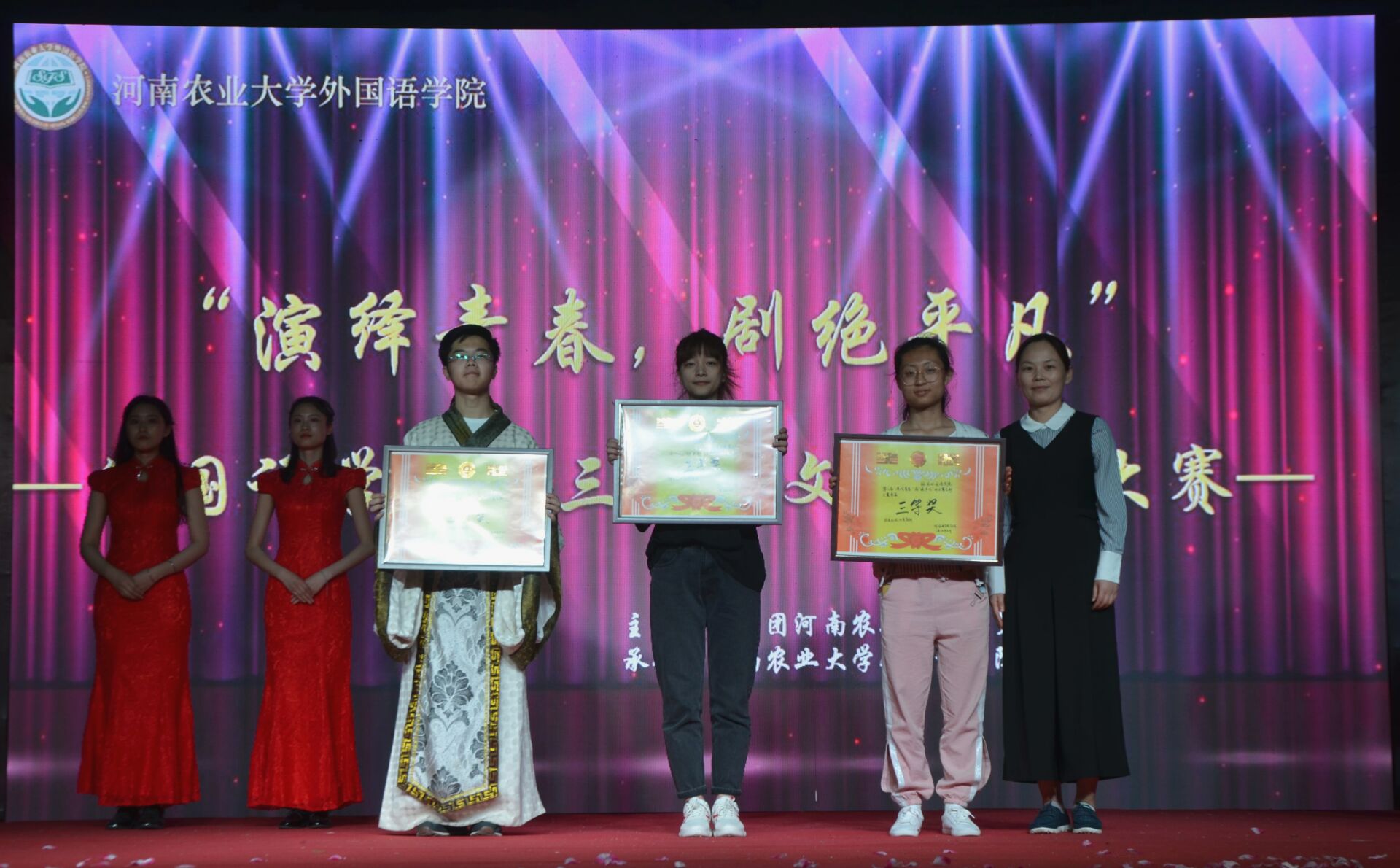 于2019年5月10日晚上六点半在龙子湖校区一餐厅广场举办外文舞台剧大赛决赛。校党委副书记、工会主席李成吾、院关工委常务副主任吴海峰、校团委书记马菲等出席比赛,张莉、杨华、刘靖宇、刘佳、聂宝玉担任评委。学院领导班子携师生代表观看了比赛。