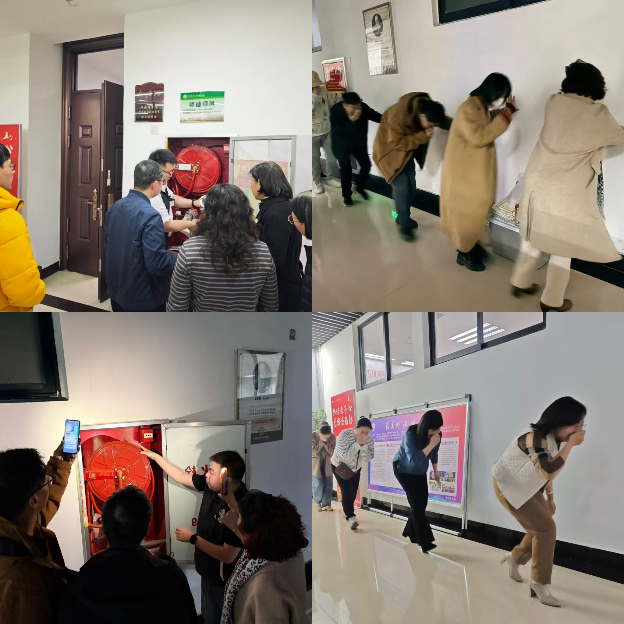 实操演练环节在学院走廊消火栓区域分批次进行。教员打开箱门,详细讲解消防软管、水带、接口、水枪及阀门的安装方法与使用注意事项,并邀请教职工进行实操练习,确保关键时刻“会操作、能应急”。