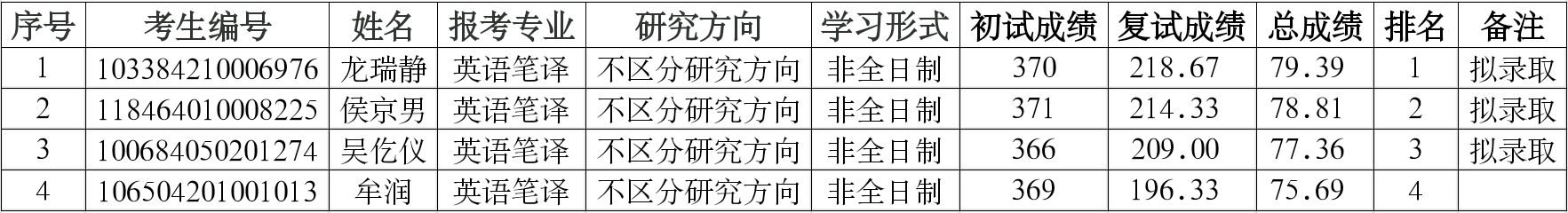 根据学校研究生招生复试工作总体安排,英语笔译非全日制硕士研究生招生计划数增加1人。哔咔漫画 2024年英语笔译非全日制硕士研究生招生第二批调剂考生复试录取工作已经结束,哔咔漫画 第二批调剂志愿复试结果公示如下,公示期至2024年4月21日,请对录取结果进行监督。