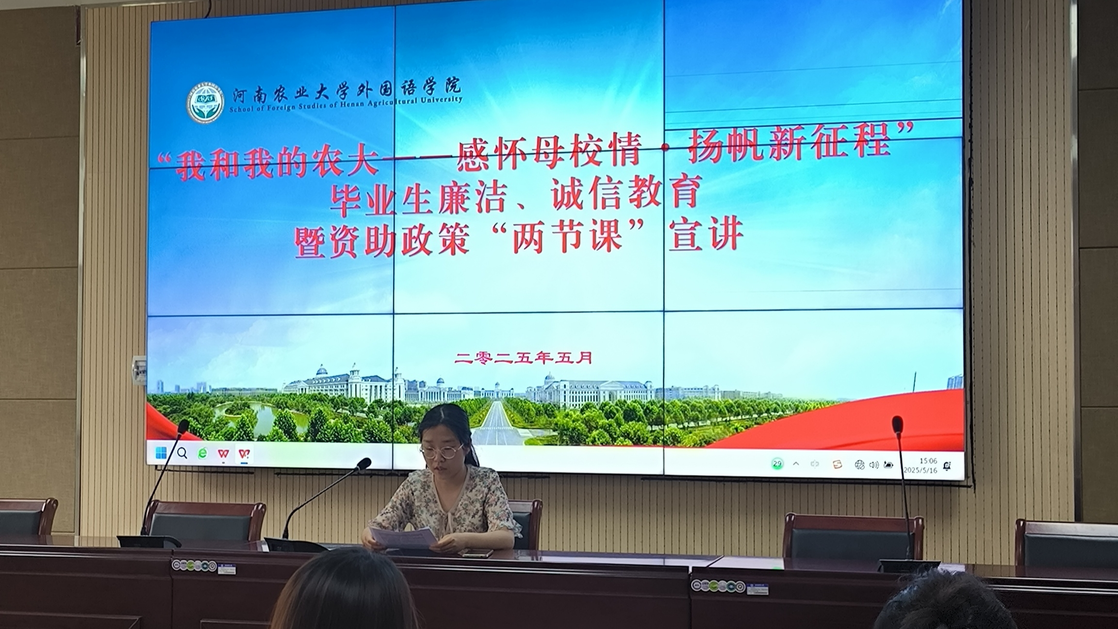本网讯(审稿:杨鑫 供稿:武宗励 田佳瑶)为进一步做好资助政策宣传工作,着力提升资助育人实效,增强2025届毕业生的信用意识,哔咔漫画 于5月16日在繁塔楼A324开展“我和我的农大——感怀母校情·扬帆新征程”毕业生廉洁、诚信教育暨资助政策“两节课”宣讲活动。本次宣讲活动由辅导员武宗励老师宣讲,2025届毕业生代表参加会议。