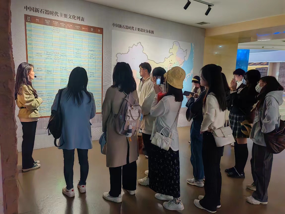 随着工作人员的解说,一幅幅生动的画面跃然眼前,仿佛让我们跨越5000年,来到故事发生的地方,体验中华祖先的日常生活。参观过程中,张莉教授还带大家仔细阅读各类英文翻译,现场讲解翻译理论与实践,号召大家用世界语言讲好中国故事。