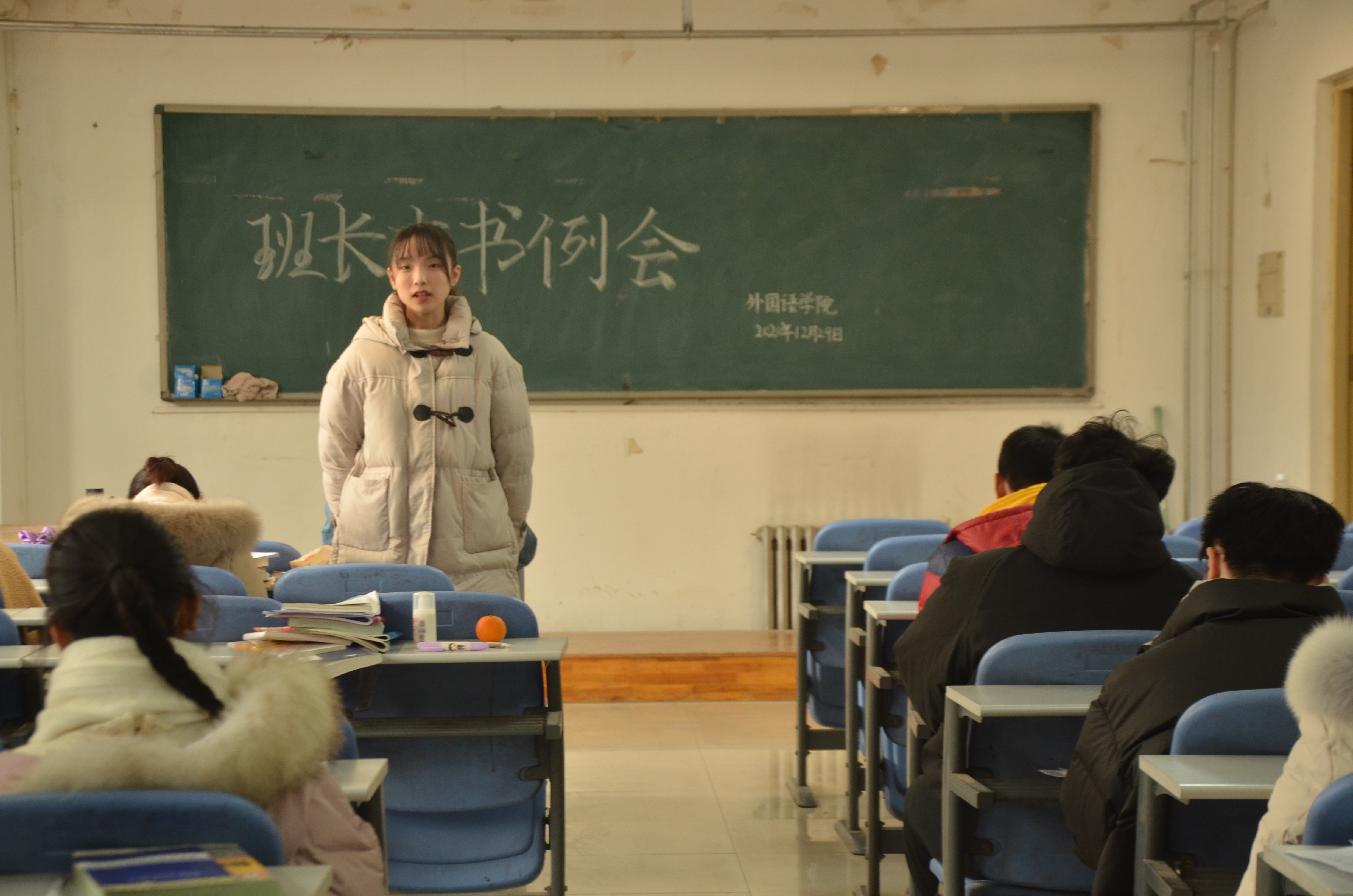 会议伊始,团委副书记冯超传达了关于元旦放假的通知,他指出,近期多地疫情出现反弹,防控形势严峻,各班班长支书要向同学们传达到位,假期坚持“非必要不外出”原则,如需要外出,则需严格按照规定进行请假,以保障同学们的安全;针对即将到来的期末考试,他强调,尽管备考时间紧,复习任务重,各班同学也要牢固树立诚信考试的观念,认真复习,杜绝作弊,用真水平考出真成绩;随后,辅导员牛烁对餐厅志愿者值班工作作了进一步安排,针对值班时间与考试时间相冲突的问题,她建议同学们根据实际情况灵活变通,及时做出相应的调整,以保证考试与值班两不误。