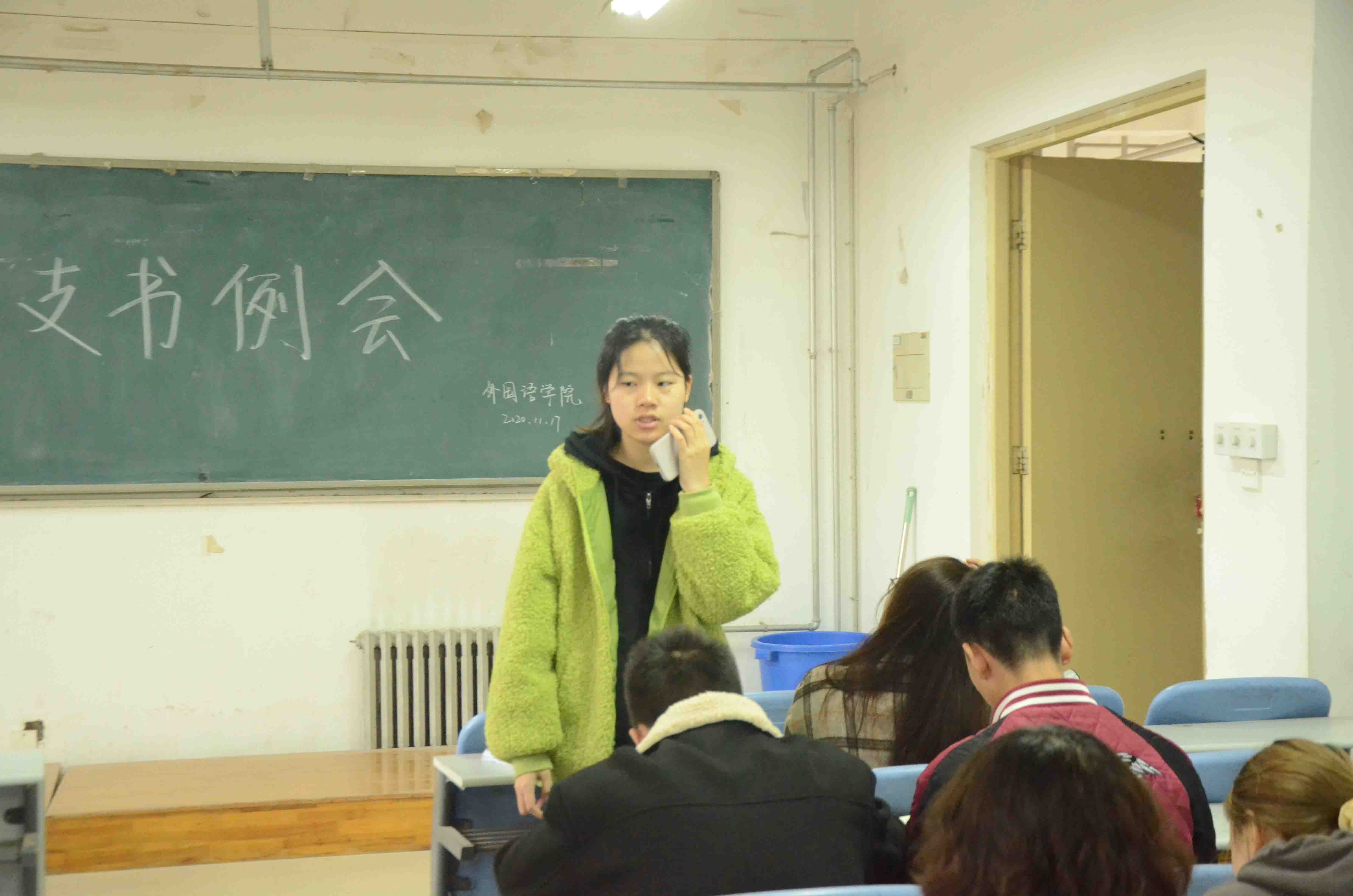 青年大学习中的表现提出表扬,并就相关团员推荐问题强调了思想认识的重要性,希望各班长支书加强对同学们的思想正确引领,使其在组织上更在思想上入党入团;随后,社团部对餐厅值班活动进行了总结并对即将到来的冬至与文化周末晚会相关工作进行了安排,她鼓励各班同学踊跃报名,发挥专业优势,积极进行节目创新;针对上周进行的消防演练活动,生保部提醒各班长支书要积极引导班级同学提高安全意识,注意宿舍用电等安全问题,将理论知识运用到实践中去,防患于未然;会议最后,学实部负责人传达了专四模拟考试的通知,提醒同学们认真对待,按时到场,诚实守信,并预祝大家取得出色成绩。