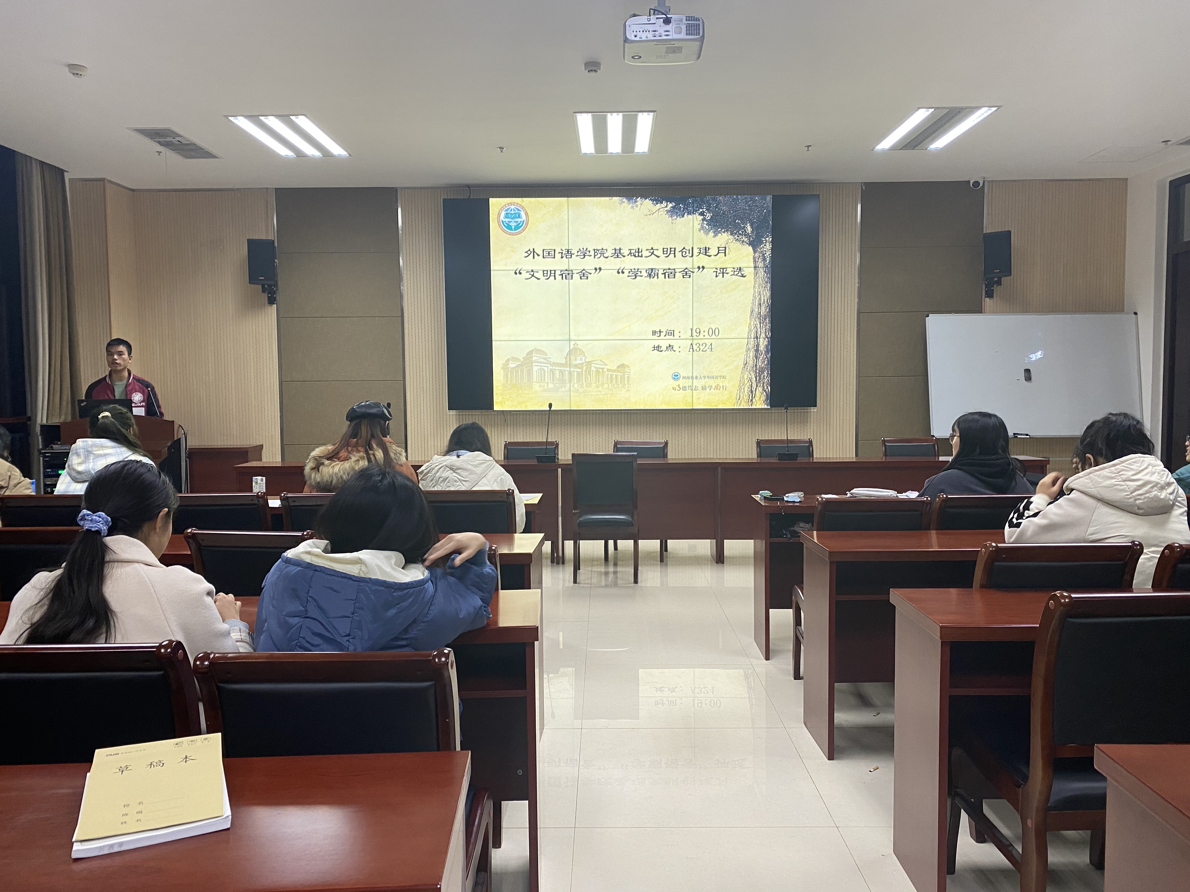 于龙子湖校区繁塔楼A324会议室举办“学霸宿舍”暨“百佳文明宿舍”评选大赛。哔咔漫画