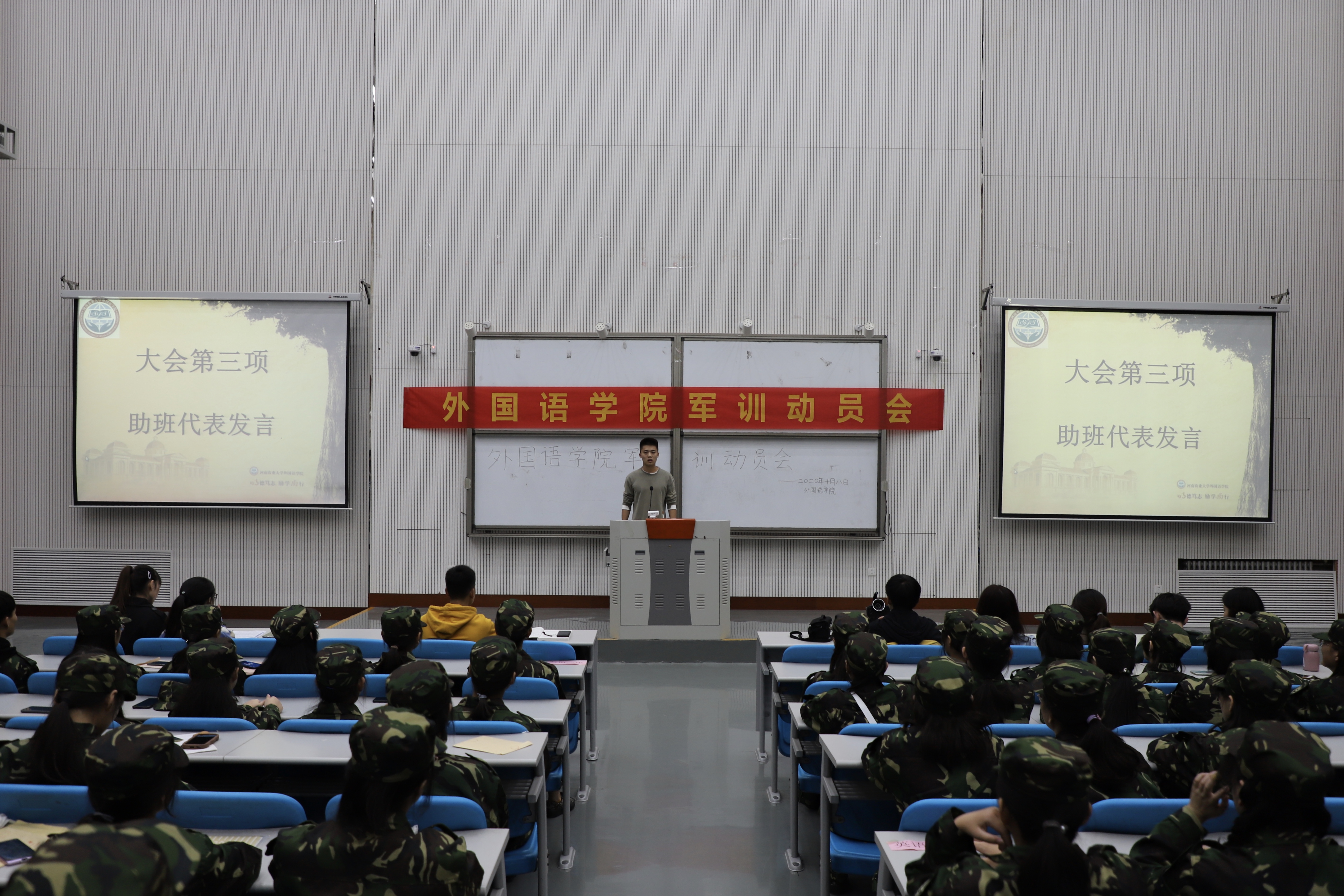 于龙子湖校区繁塔楼BC间大教室4隆重举行了2020届新生军训动员大会。本次大会由团委办公室主任张丹丹主持,辅导员闫雪茹携全体迎新志愿者及2020级新生共同参加本次大会。