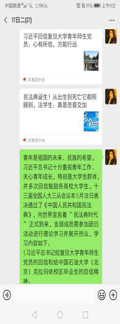 学院各团支部积极响应号召,有序组织各班同学通过多种形式学习相关内容。首先,各团支部在各班团支书的引导下认真阅读习总书记回信内容,并以支部为单位展开热议。各班同学纷纷表示一定会不忘初心,将个人的理想追求融入党和国家事业之中,用实践践行回信精神;在学习《民法典》相关内容中,同学们通过微信推送等多种渠道获取信息,认识到了《民法典》的重要意义及其在我国社会和人民生活中发挥的重要作用。各团支部亦通过腾讯会议、钉钉、QQ群等平台对所学内容及个人心得进行了交流和分享,支部同学踊跃分享自己的所见所感,并表示会脚踏实地认真学习专业知识,投身祖国建设。