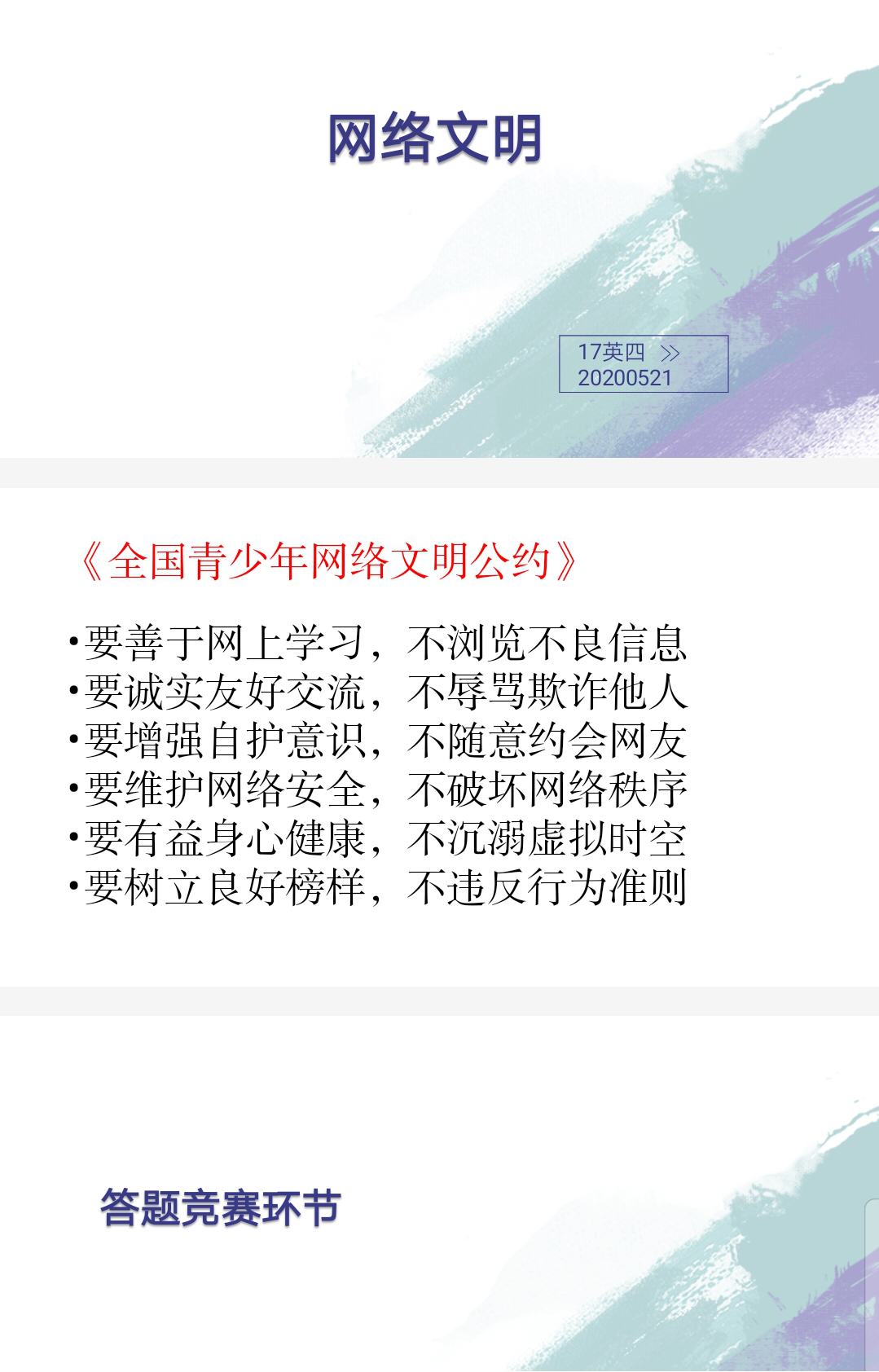 本次班会主要针对网络不文明现象以及如何文明上网两个问题展开。会上,各班心委总结出散播谣言、网络欺诈、网络暴力等网络不文明行为,向同学们阐述了文明上网的重要性,并告诫同学们要学会甄别虚假信息,正确使用网络资源,合理发表个人言论,做网络的主人。随后,各班心委将《网络文明公约》转发至班群供同学们学习阅读,各班同学在班群发表热议,展开积极讨论。同学们纷纷表示一定会在网络上坚持正确的政治方向和舆论导向,自觉遵守国家有关互联网的法律法规,坚持依法上网,提高网络安全防范能力,自觉维护我国网络媒体的良好发展环境。