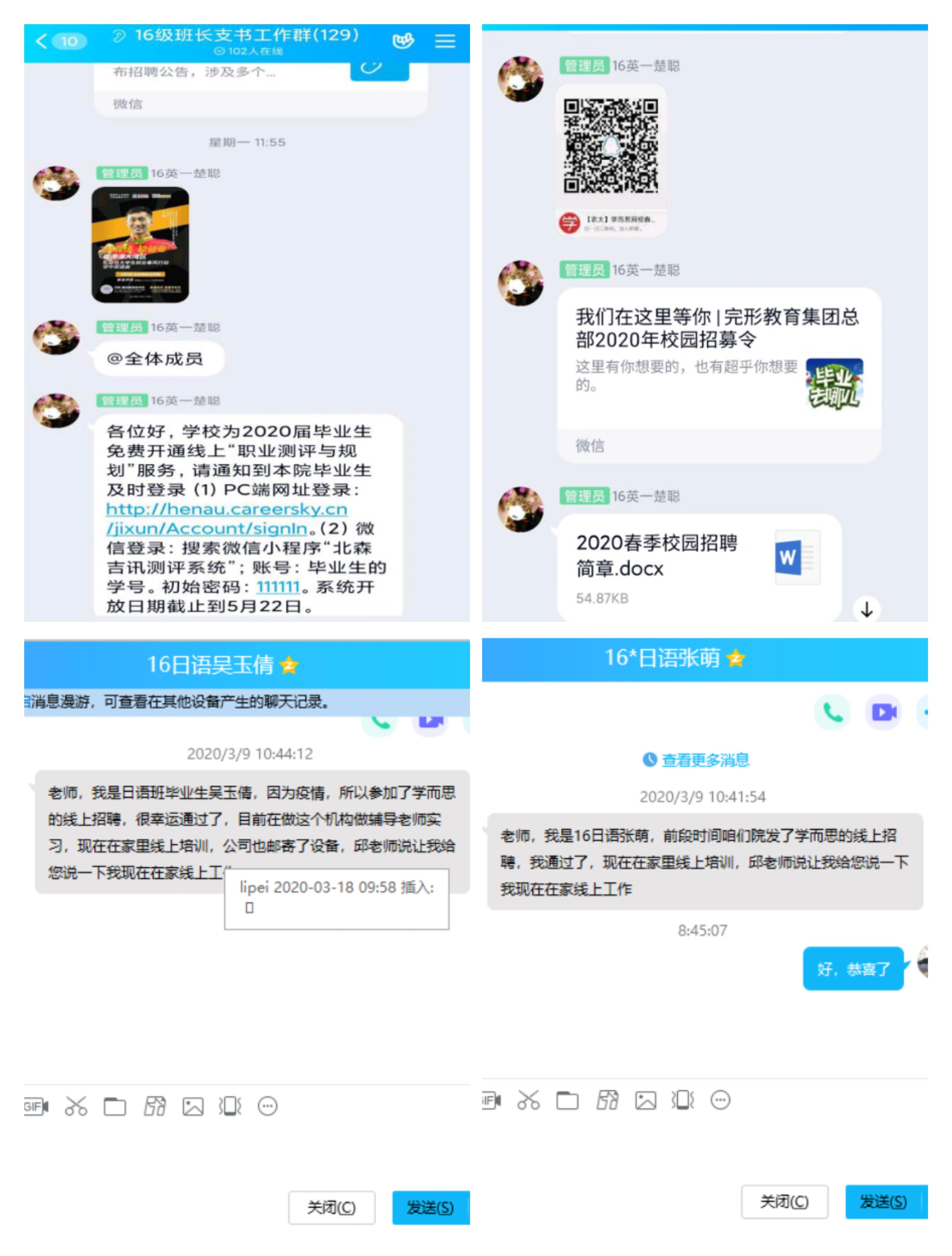 筹建了毕业生工作领导小组,由邓然老师、院学生会、推免生具体负责开展网上双选会等系列毕业生就业、服务、帮扶活动,为毕业生提供就业指导,拓宽就业渠道,减轻毕业生因疫情而产生的就业压力,帮助毕业生顺利就业。截止目前,院学生会通过网络邀请了30余家用人单位来学院开展线上招聘活动,已有多人成功就业。