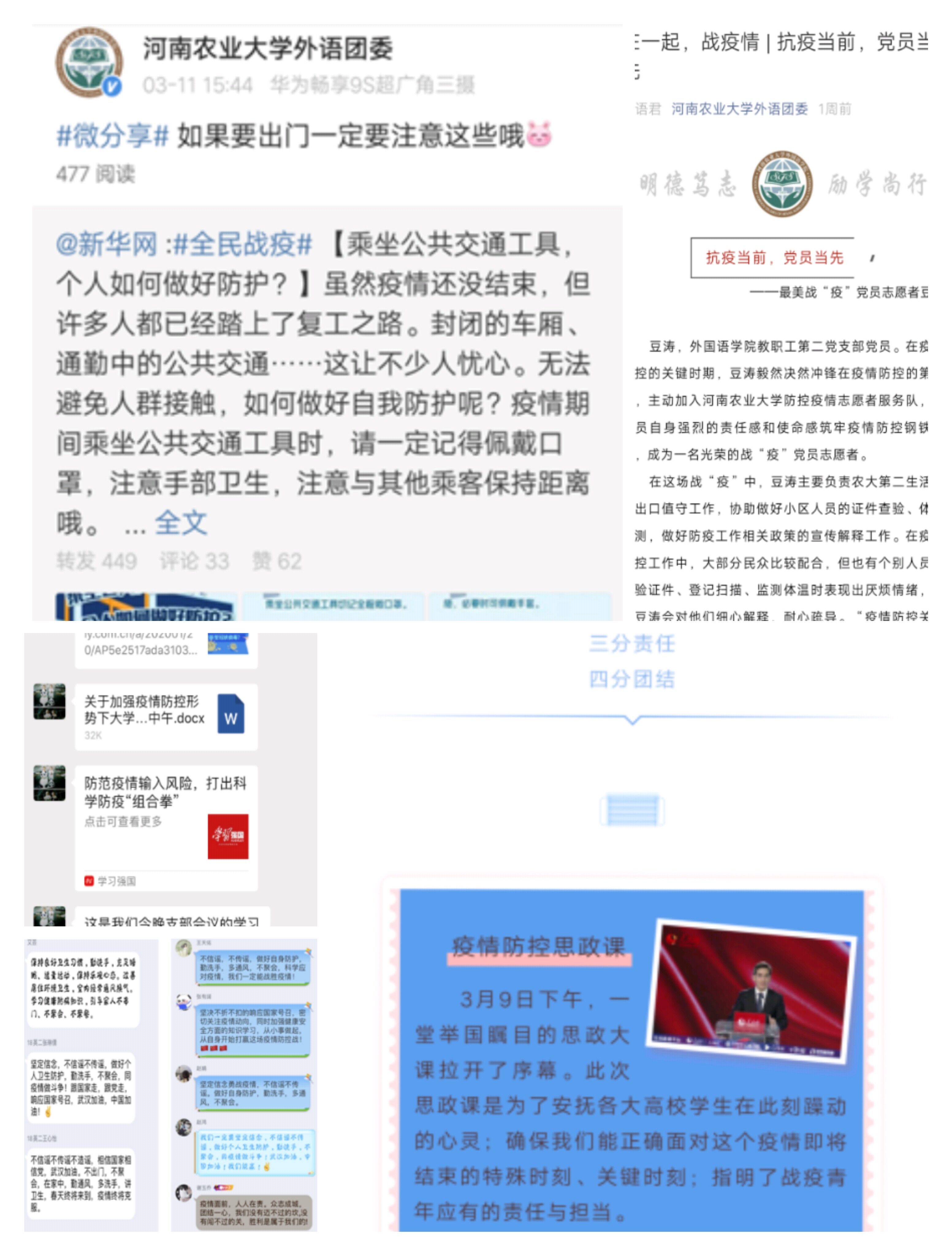 有效利用网络资源,通过QQ群、微信、学习强国、青年大学习等平台组织学习防疫知识,引导学生理性认识疫情,做好科学防护。分享战“疫”事迹。通过分享18MTI陈亚婷、18英二申子辰等学院防疫志愿者的先进事迹,帮助学生塑造积极乐观的心态,引导学生积极投入地方疫情防控工作中去,营造了良好温情的防疫氛围。树立战“疫”自信。组织全体师生共同观看思政大课,了解国家战“疫”成果、学习战“疫”英模事迹,并号召各班积极开展系列主题班会和团日活动,引导学生自觉树立起战“疫”必胜的自信,充分体会中国速度、中国精神和中国力量,增强学生坚定“四个自信”,充分认识到我国的制度优势。