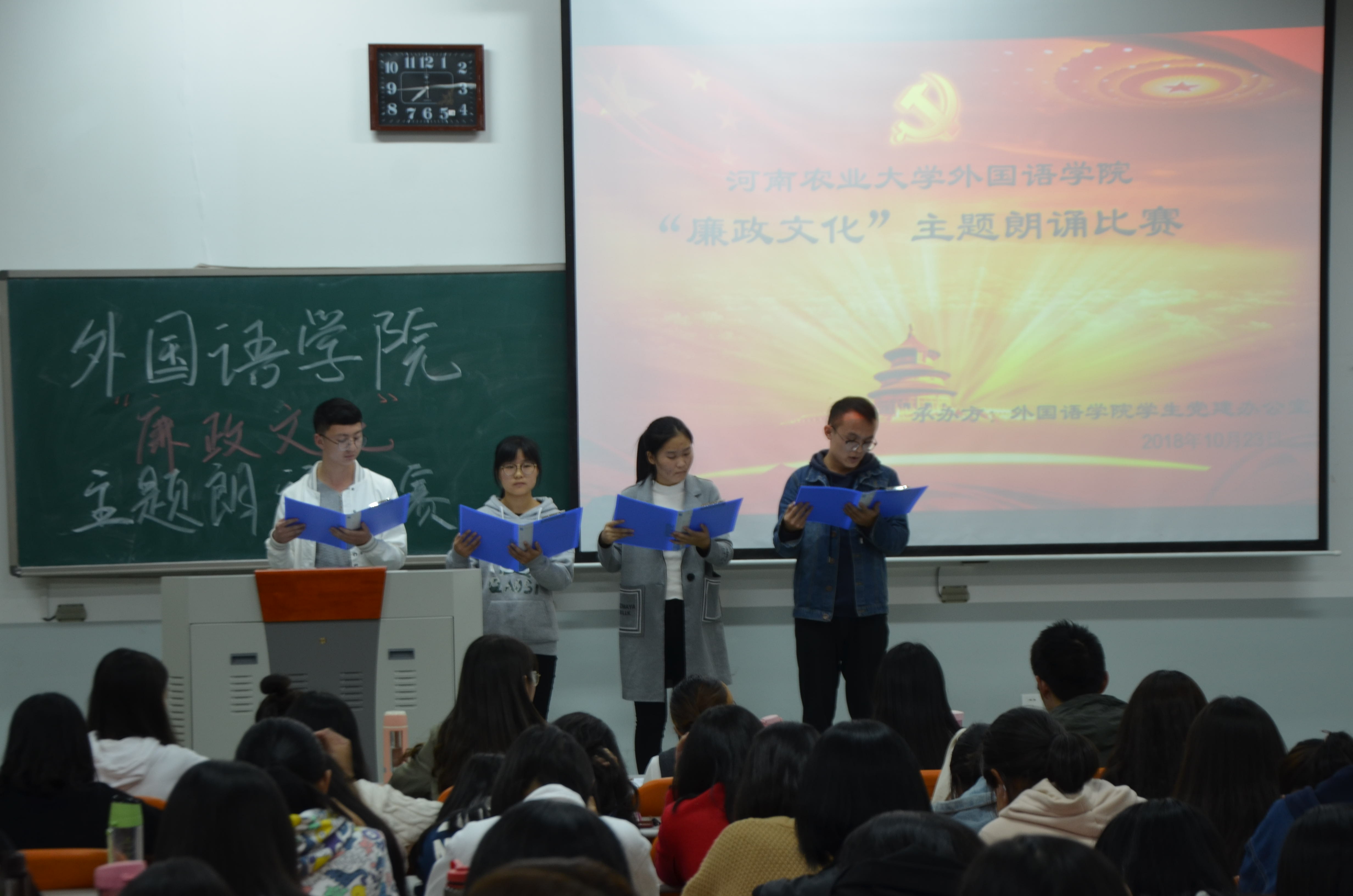 本网讯(审稿人:王颖 供稿人:饶芝玉)为宣扬廉洁文化核心内涵,贯彻落实廉政文化精神,10月23日晚7点,学院于龙子湖校区繁塔楼教室C406举办了“廉政文化”主题朗诵比赛。本次比赛由主要学生干部担任评委。