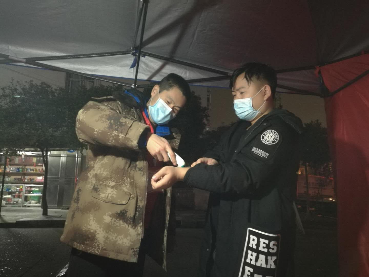 民政党员志愿者王磊对进入小区的居民测量体温