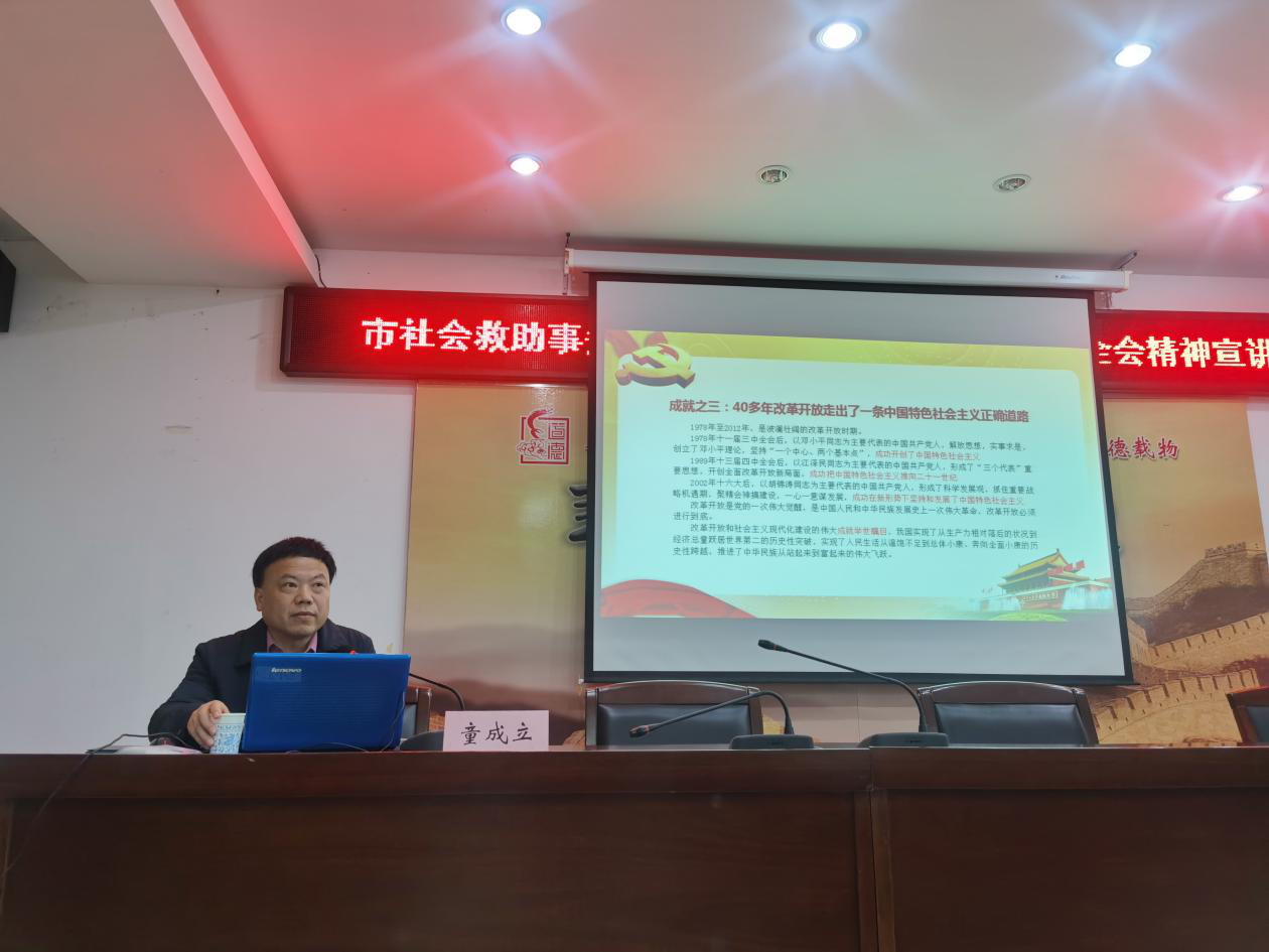 12月24日,市社会救助事务中心召开学习贯彻党的十九届六中全会精神宣讲会暨第四季度党员大会。市直机关工委副书记童成立作专题宣讲,党支部书记、主任卞德荣同志主持会议,中心全体干部职工、退休党员参加。