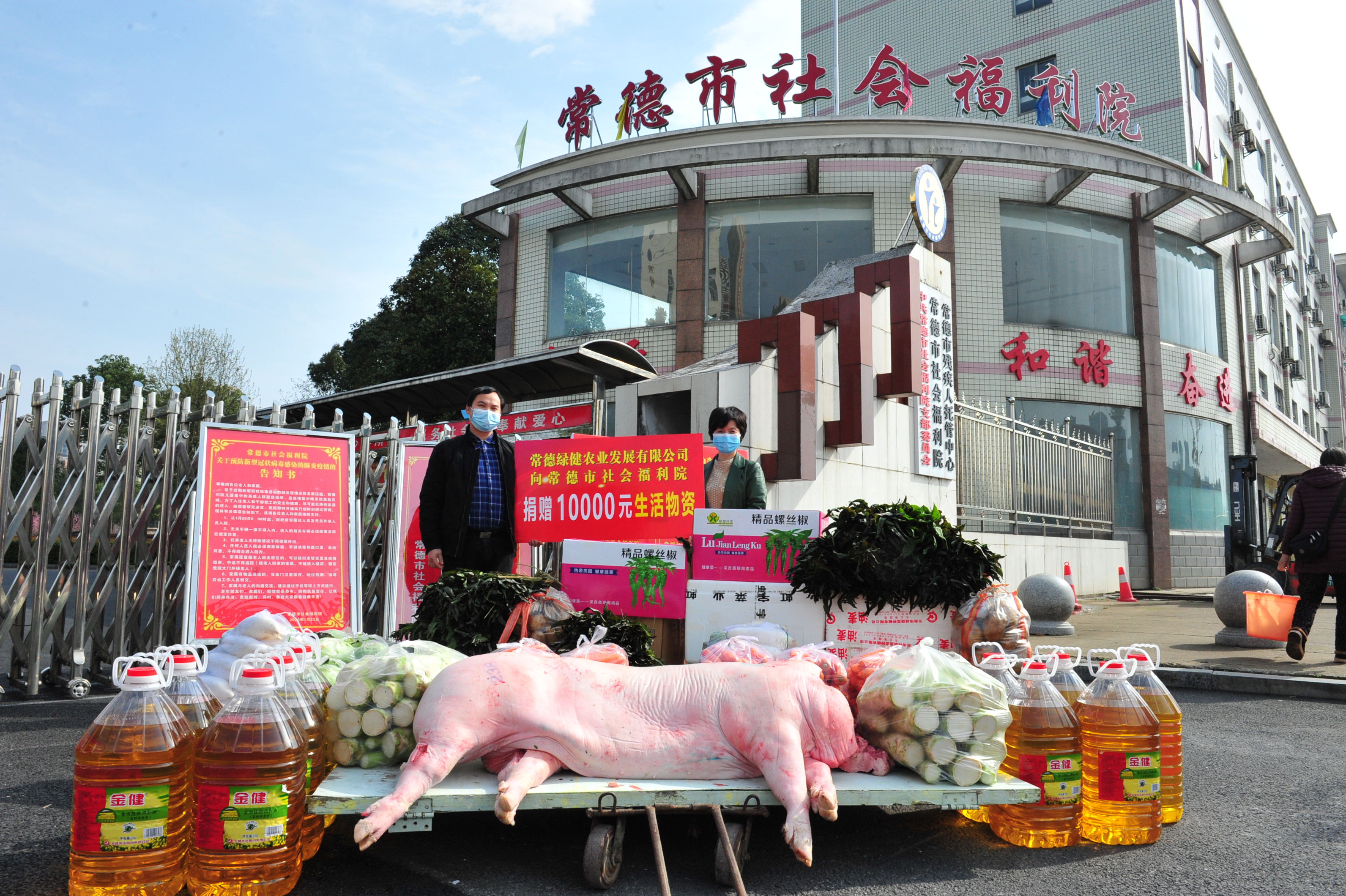 10点,市退役军人事务局联系的本土爱心企业——常德市绿健农业有限公司为市福利院送来了生猪、米、面、油、时蔬等价值一万元的生活物资。