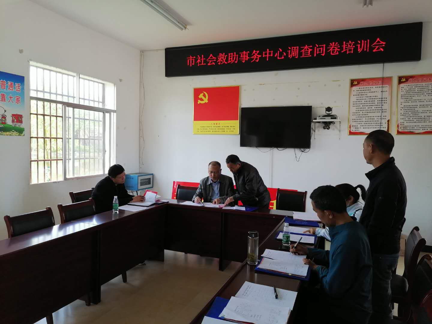 在村部会议室,驻村工作队对帮扶责任人入户走访调查进行了详细地培训。